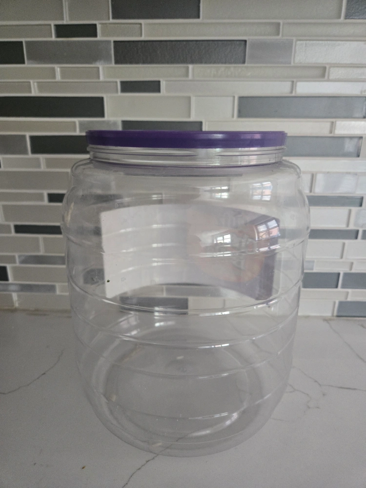 134The jar is made of clear plastic. It features a purple lid. An excellent item for storing your favorite treats, which can be so soothing.