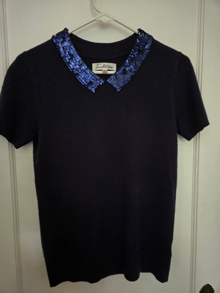 Navy blue sweater, short-sleeved. Features a jeweled collar. Perfect for adding a touch of sparkle to your day. Acrylic material