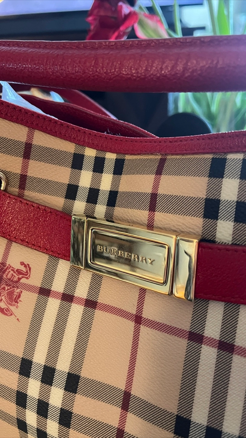 A preloved authentic Burberry handbag with red leather accents. The bag has a plaid pattern. Included is a dust bag.