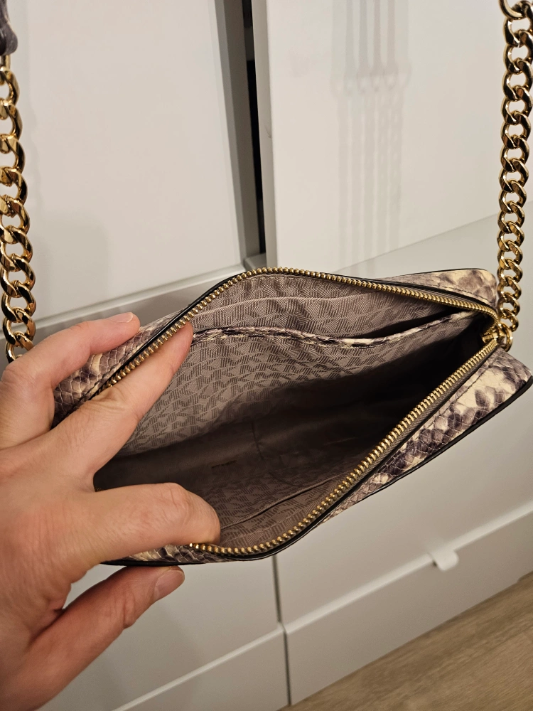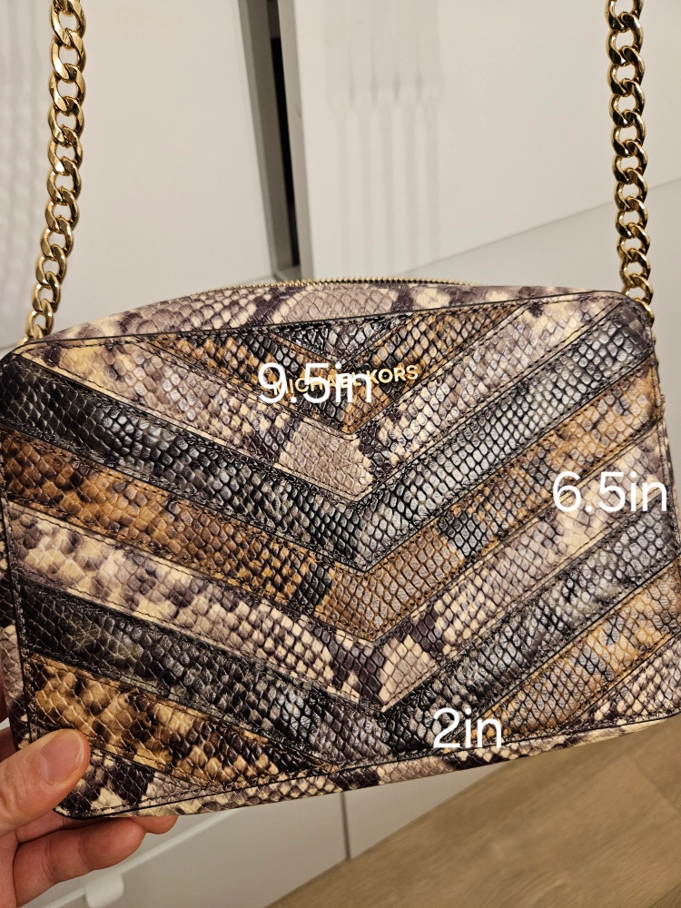 Gorgeous crossbody bag, features a snakeskin pattern with gold hardware. A great bag to go with any outfit.