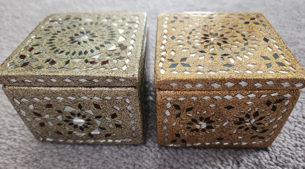 Two beautiful decorative trinket boxes. Interior is a soft red. They are square in shape. These boxes can be a charming addition to your space.