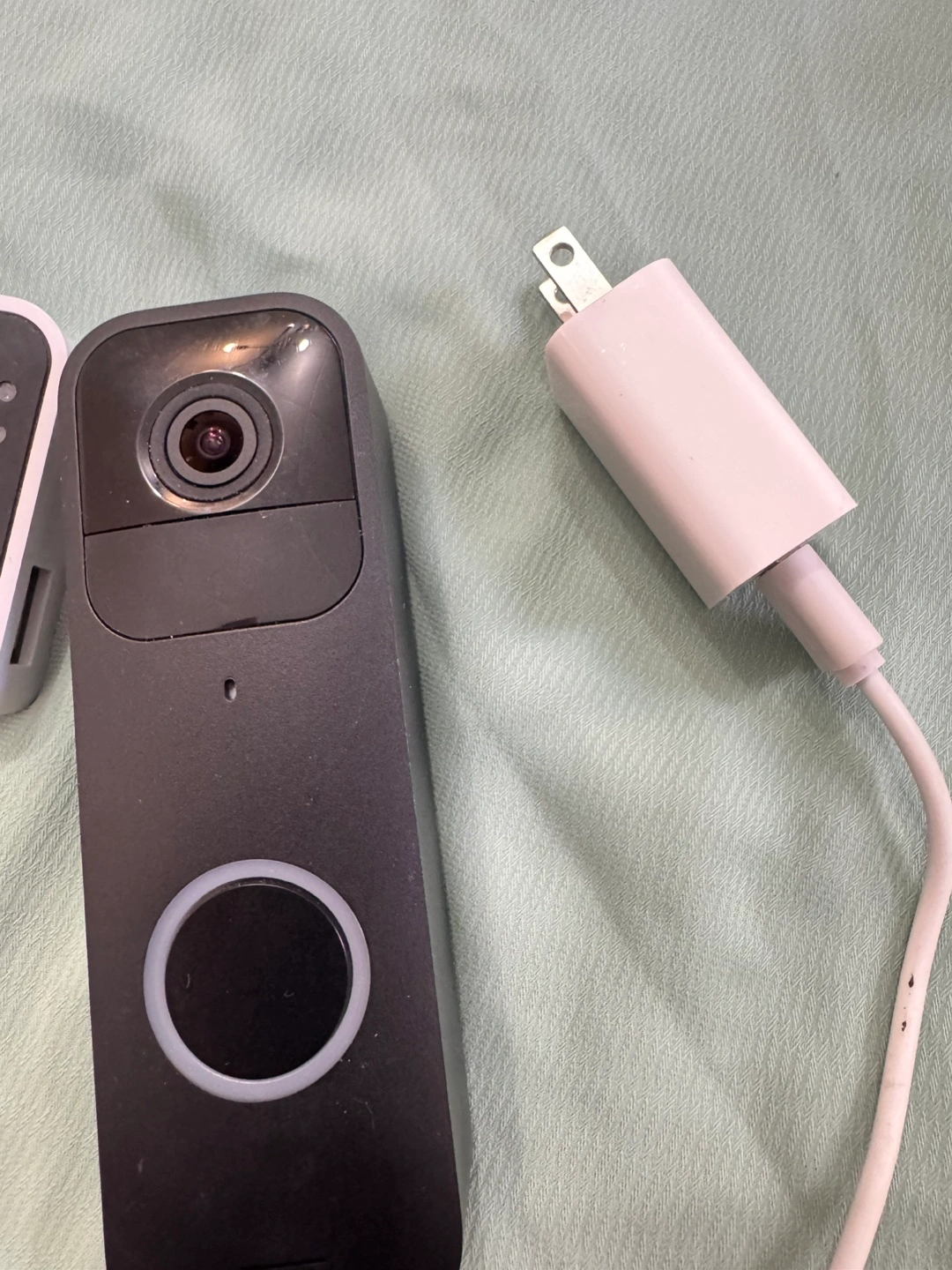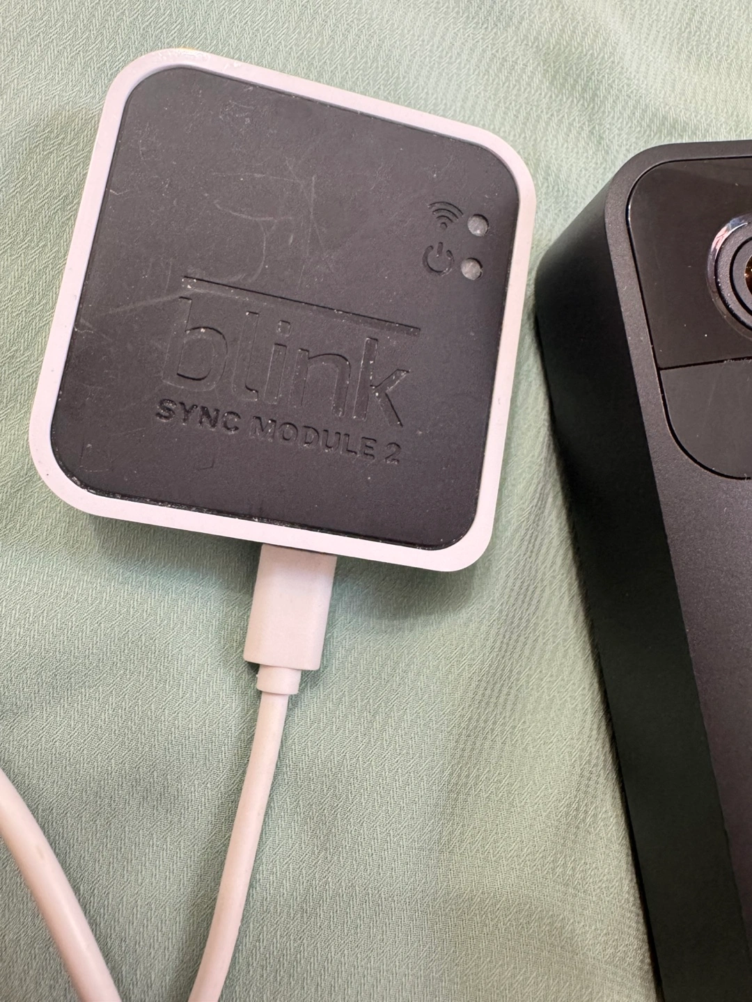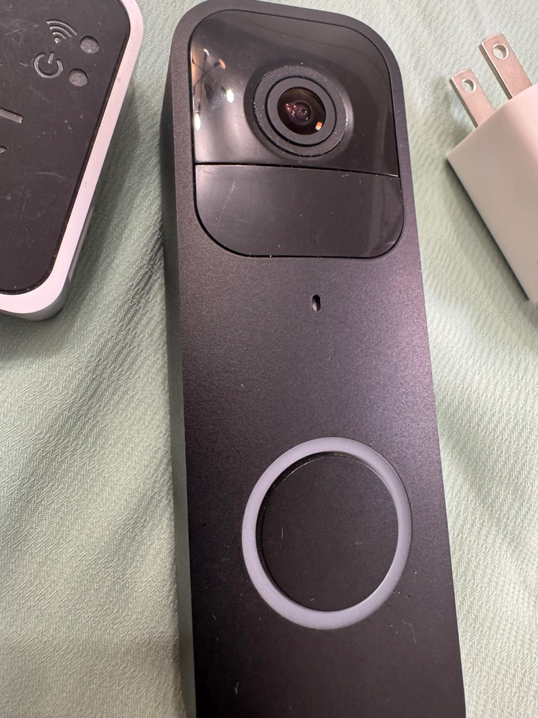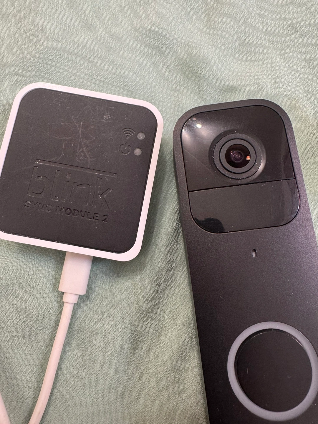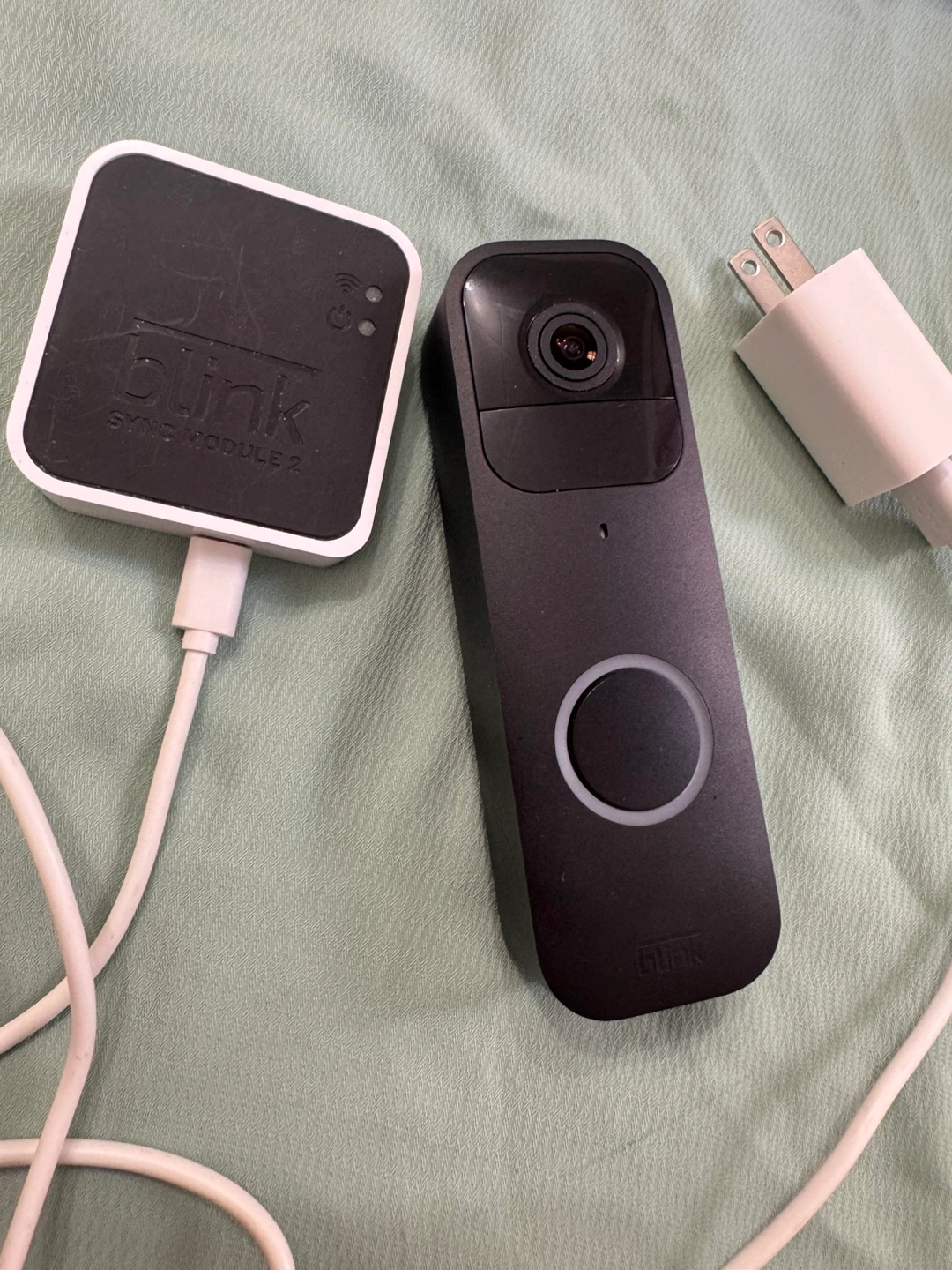 The set includes a black video doorbell, a sync module 2, and a power adapter. The video doorbell features a camera lens and a lighted ring. The sync module has a logo and connectivity indicator lights. This would be a great choice for anyone looking to add a little security to their home.