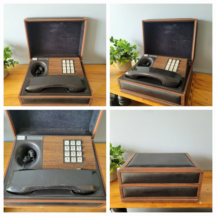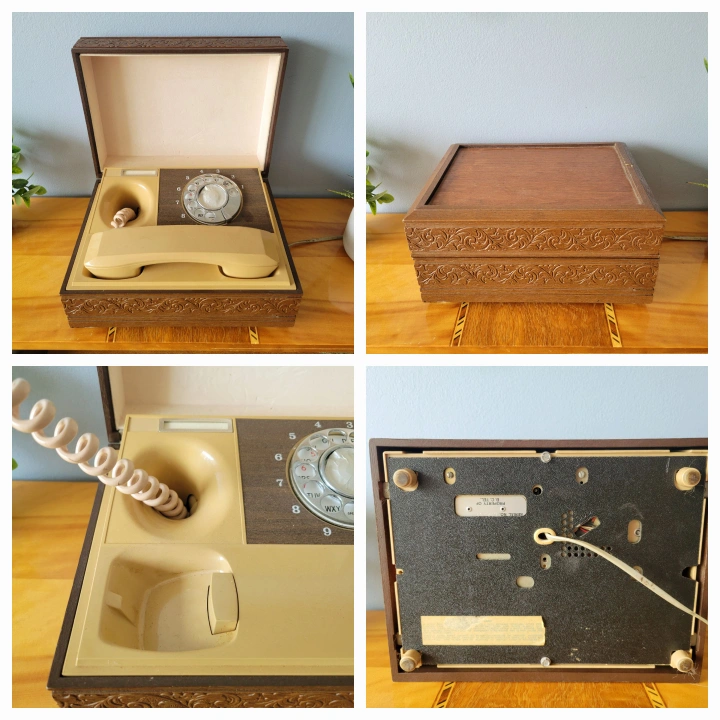 3) Vintage Deco-Tel rotary dual telephone in a wood carved case.