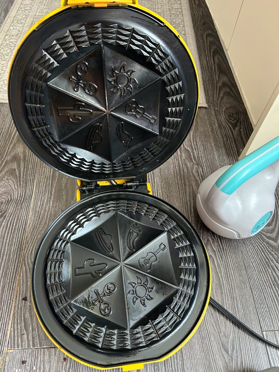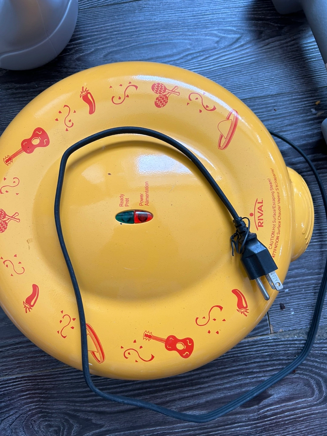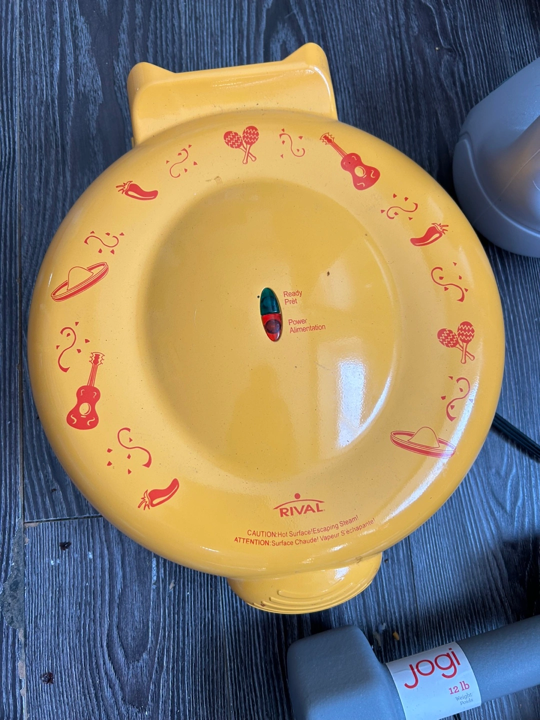 Round, yellow fajita maker. Features fajita. shell molds on the inside. Decorated with music and chili pepper symbols. You could make some delicious fakitasin this appliance, sit back, and enjoy.