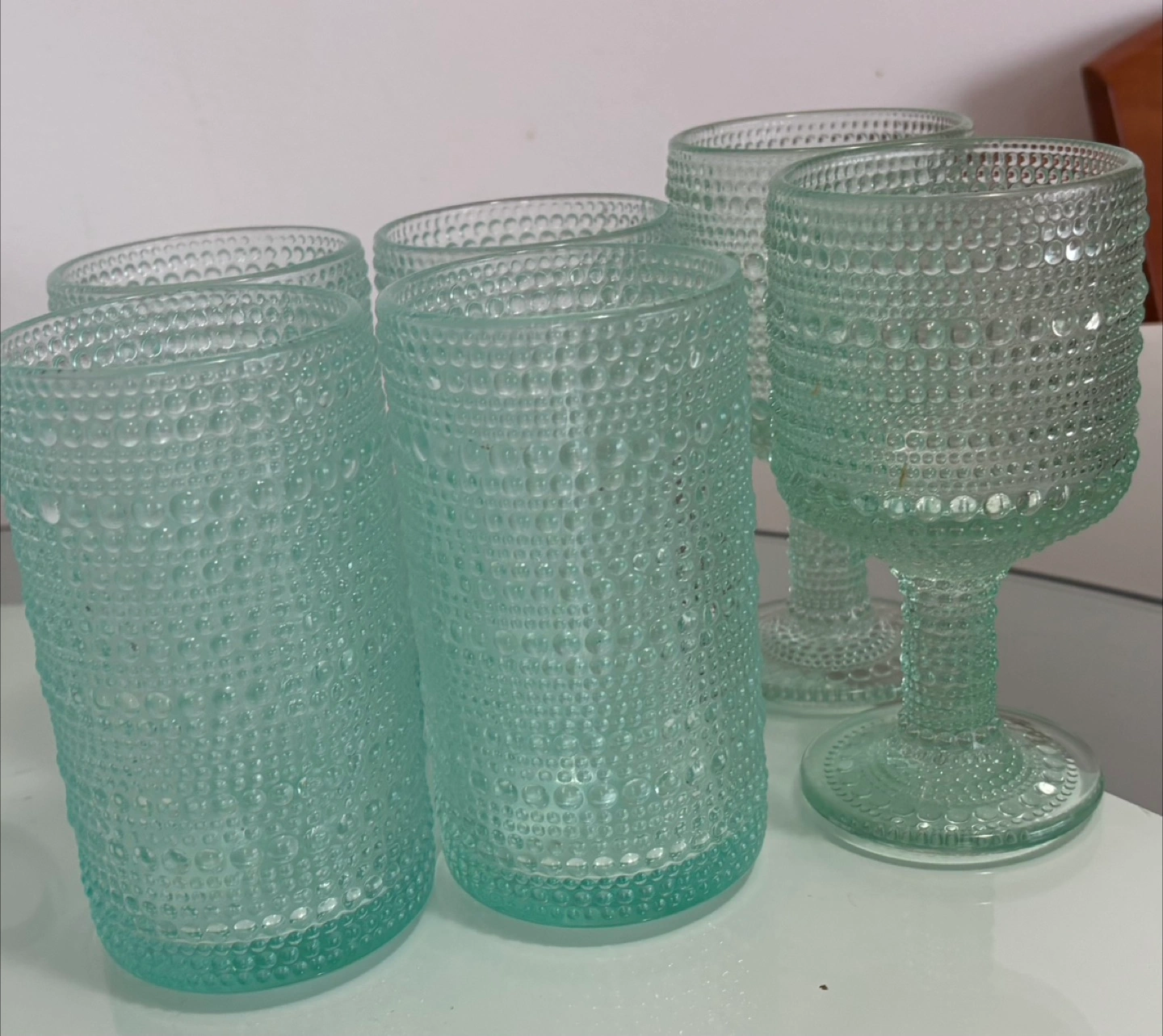 A set of beautiful aqua colored glasses. Features a textured bubble design. Four tall drinking glasses and 2 stemmed wine glasses are included.