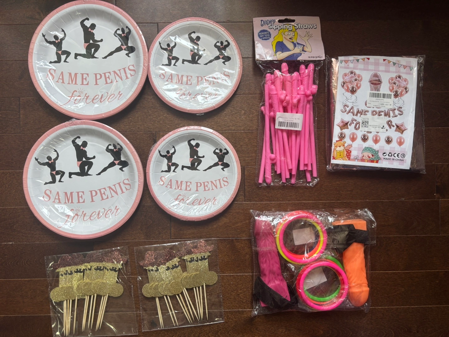 An assortment of party supplies in their packaging. Includes paper plates, straws, decorations, and more. Consider using these items for a fun time with your friends.