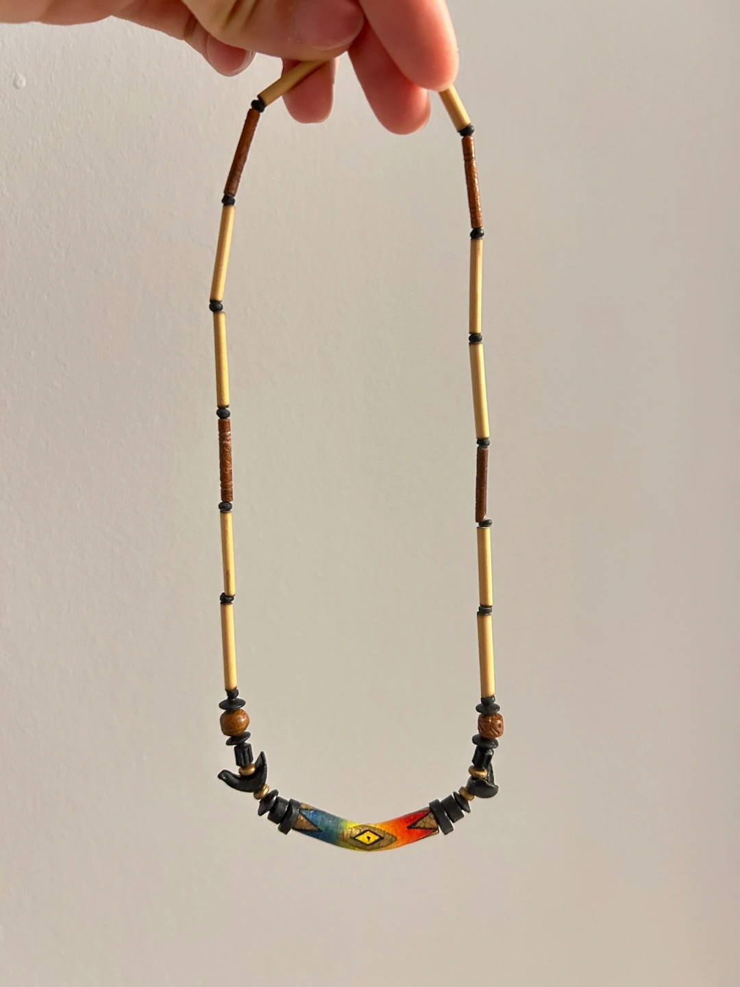 174A beautiful necklace. It is a charming accessory with a combination of wood beads and colourful centerpiece. Consider wearing this necklace to bring a smile to your face after a long day.