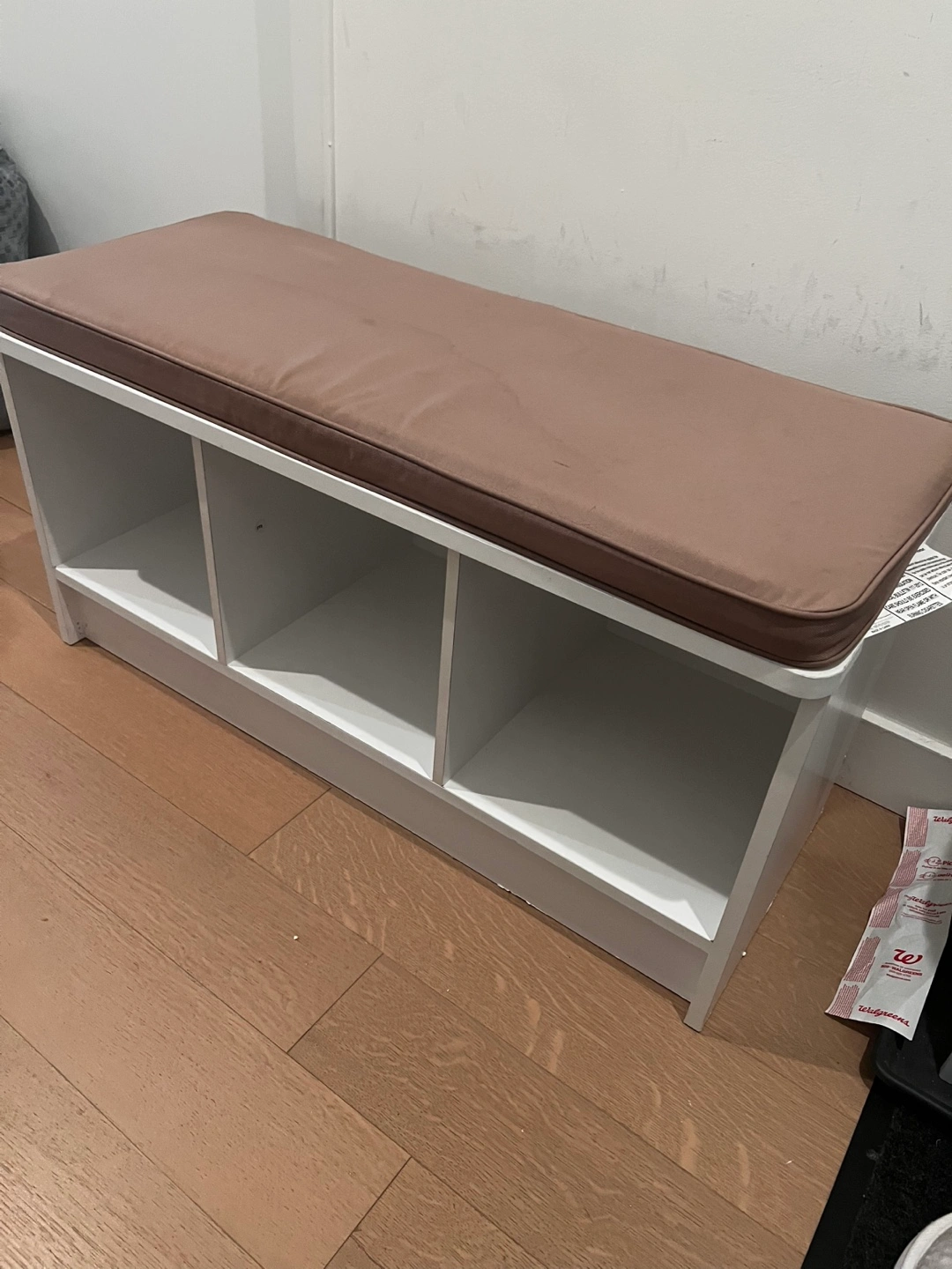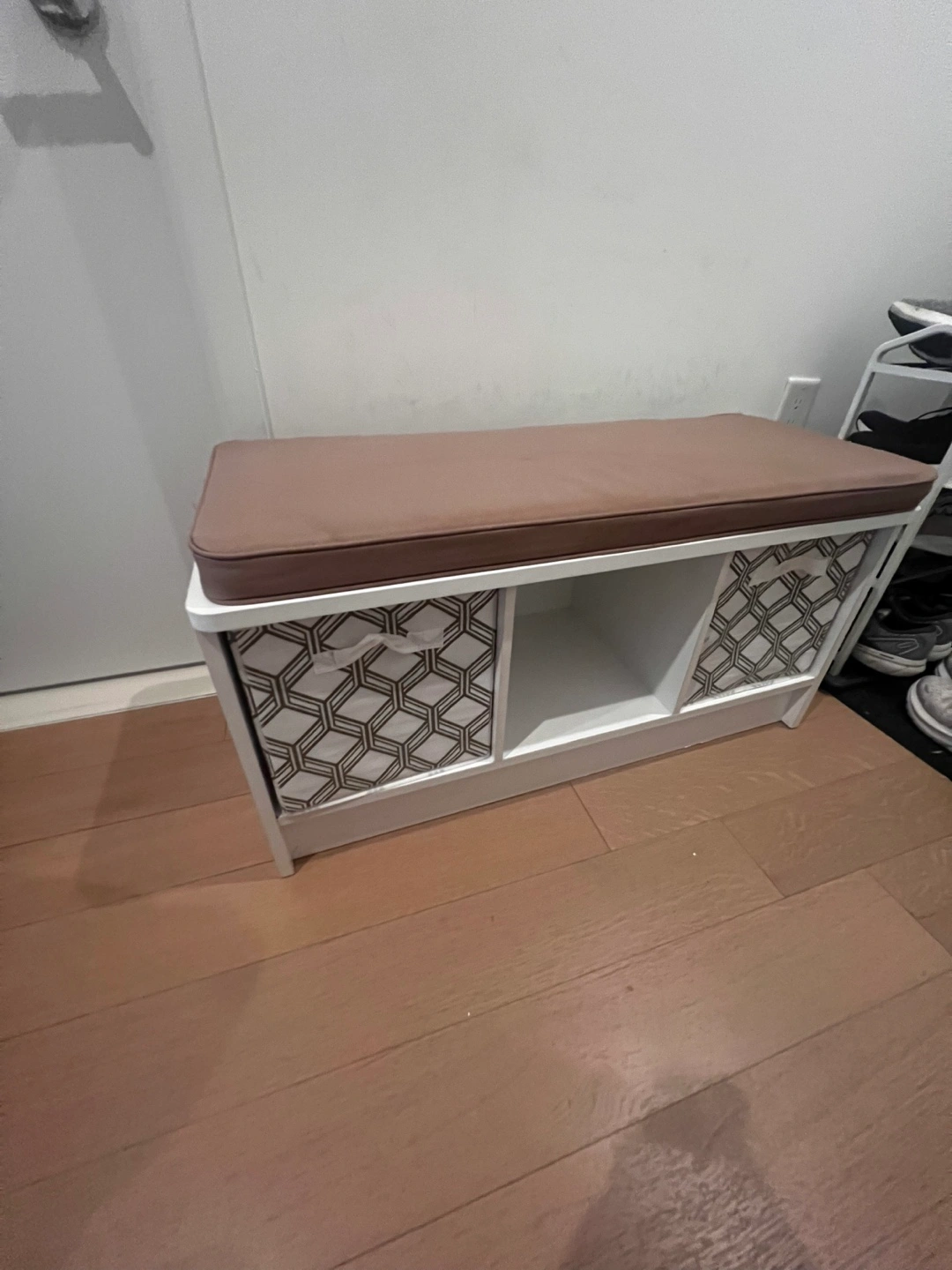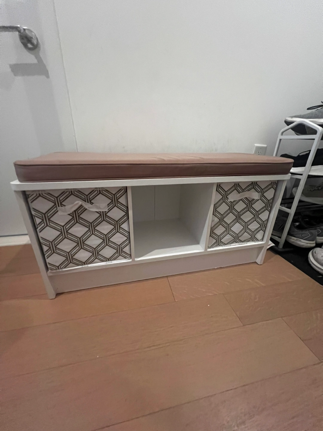 White bench with brown cushioned top. Features open storage area. Includes decorative storage bins. Consider this bench to make your home feel more welcoming after a long day. Note: The cushion has some marks on it and could benefit from a washing/spot clean.
