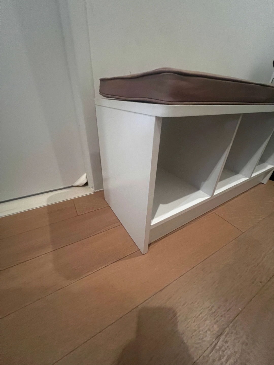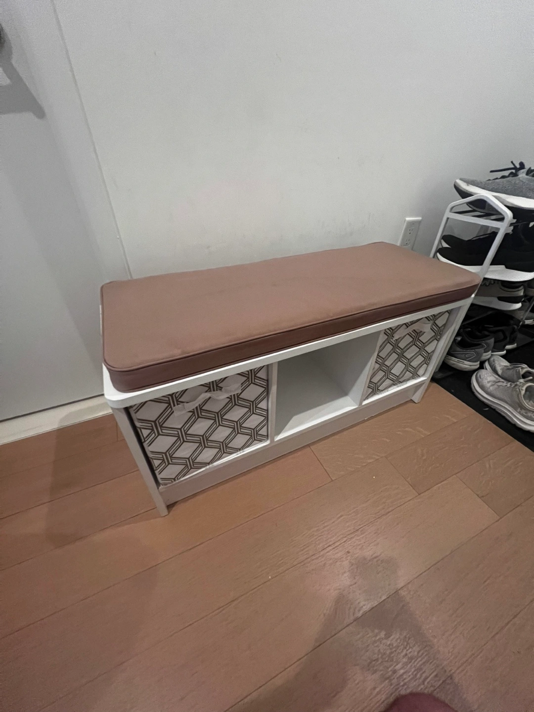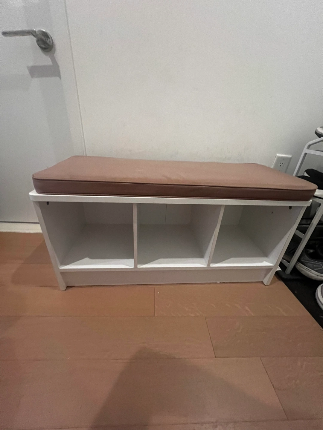 White bench with brown cushioned top. Features open storage area. Includes decorative storage bins. Consider this bench to make your home feel more welcoming after a long day. Note: The cushion has some marks on it and could benefit from a washing/spot clean.