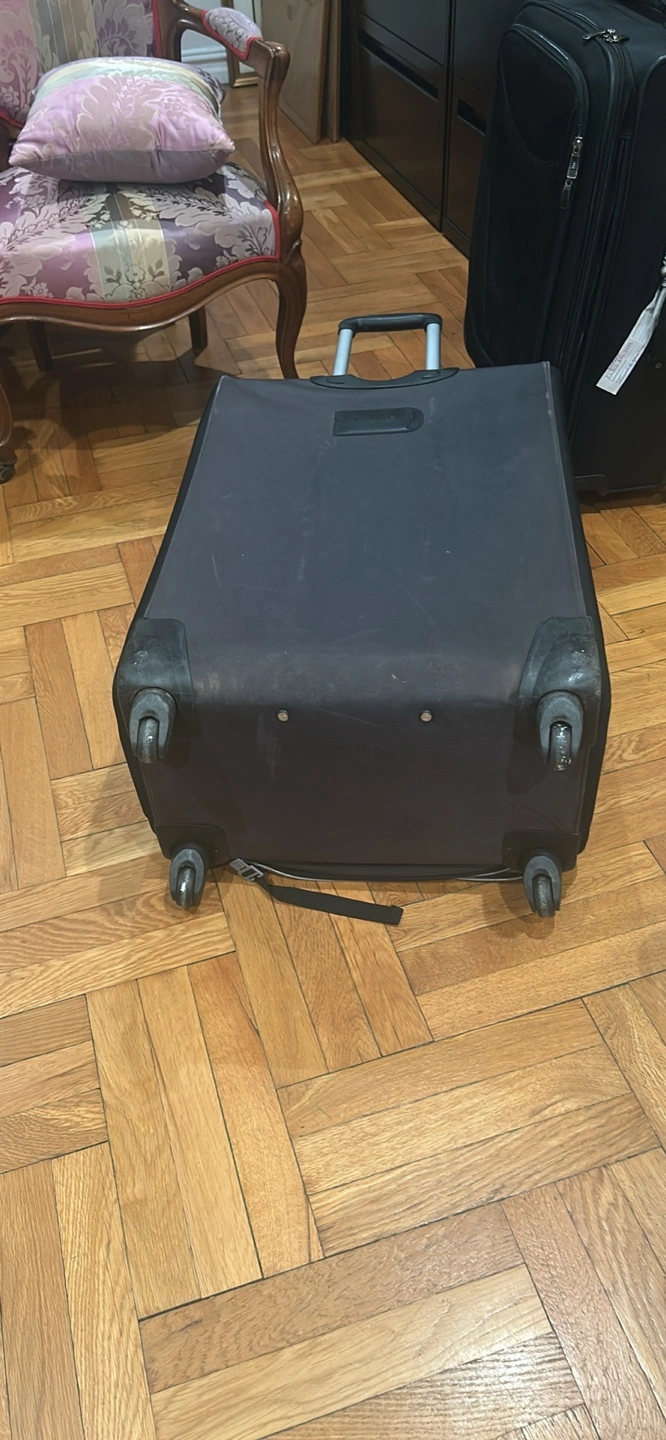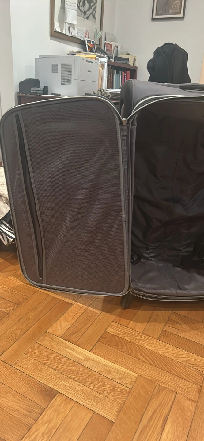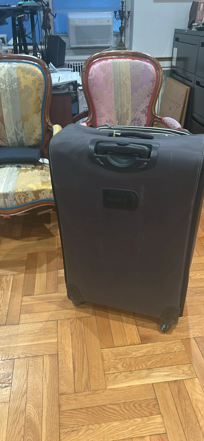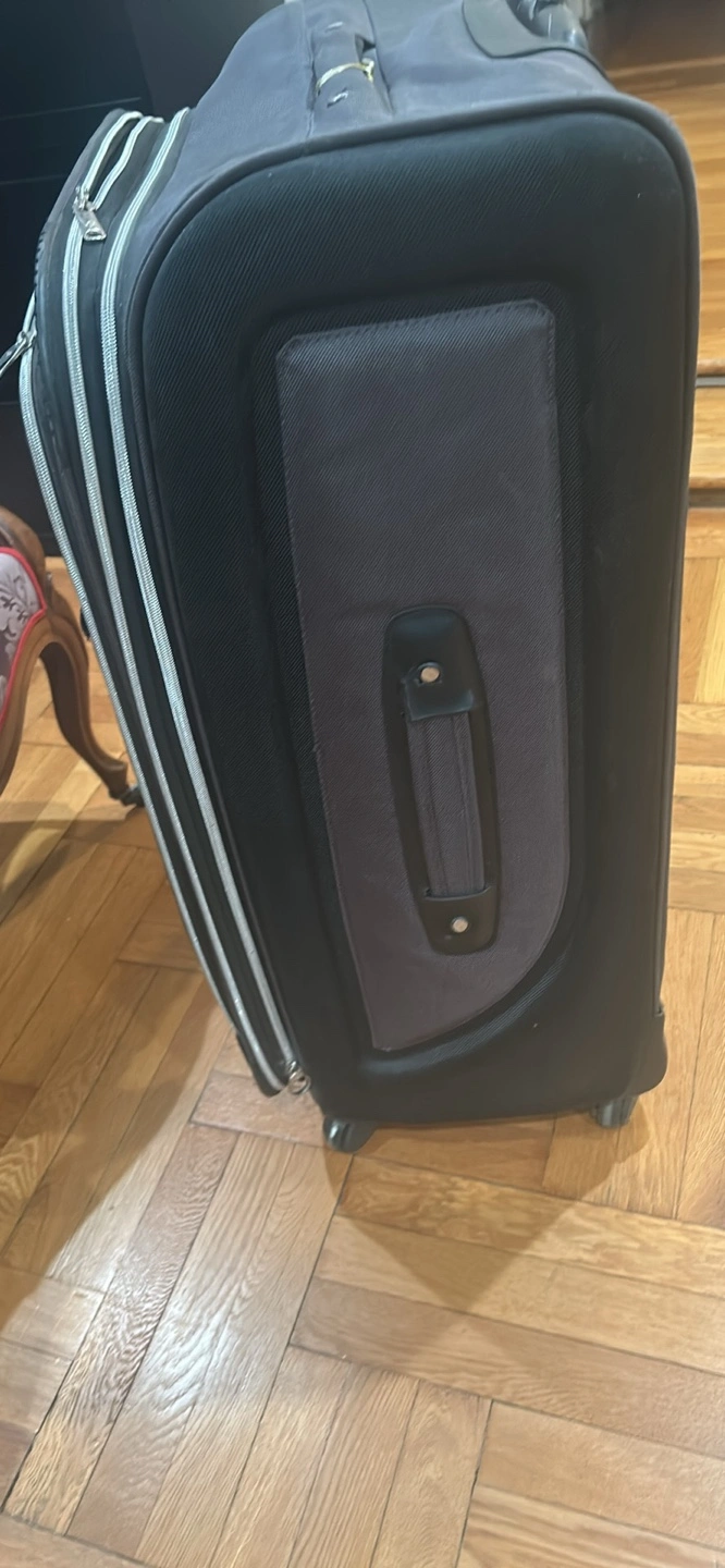 A dark gray rolling suitcase. Features zippers and multiple compartments. Perfect for your travels, this suitcase will help you relax knowing all your belongings are safely stored.