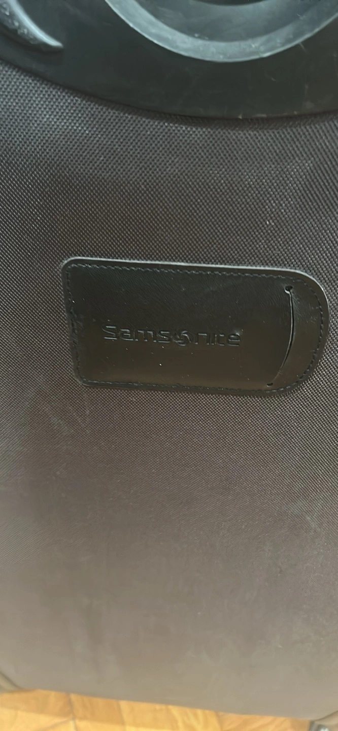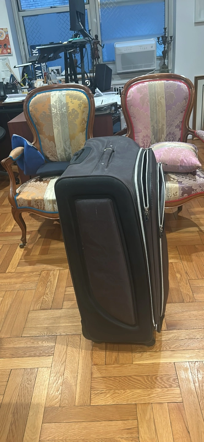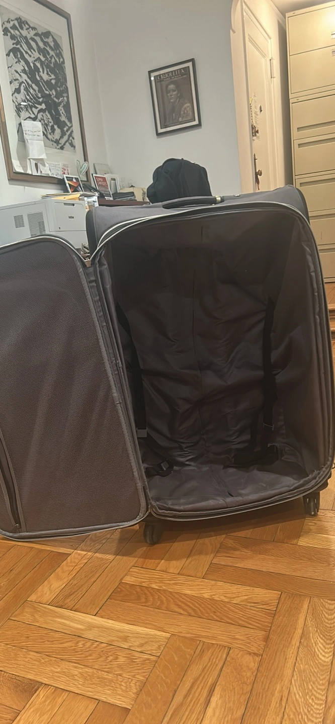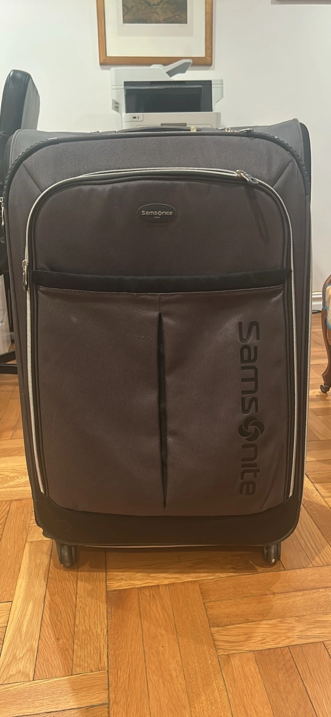 A dark gray rolling suitcase. Features zippers and multiple compartments. Perfect for your travels, this suitcase will help you relax knowing all your belongings are safely stored.