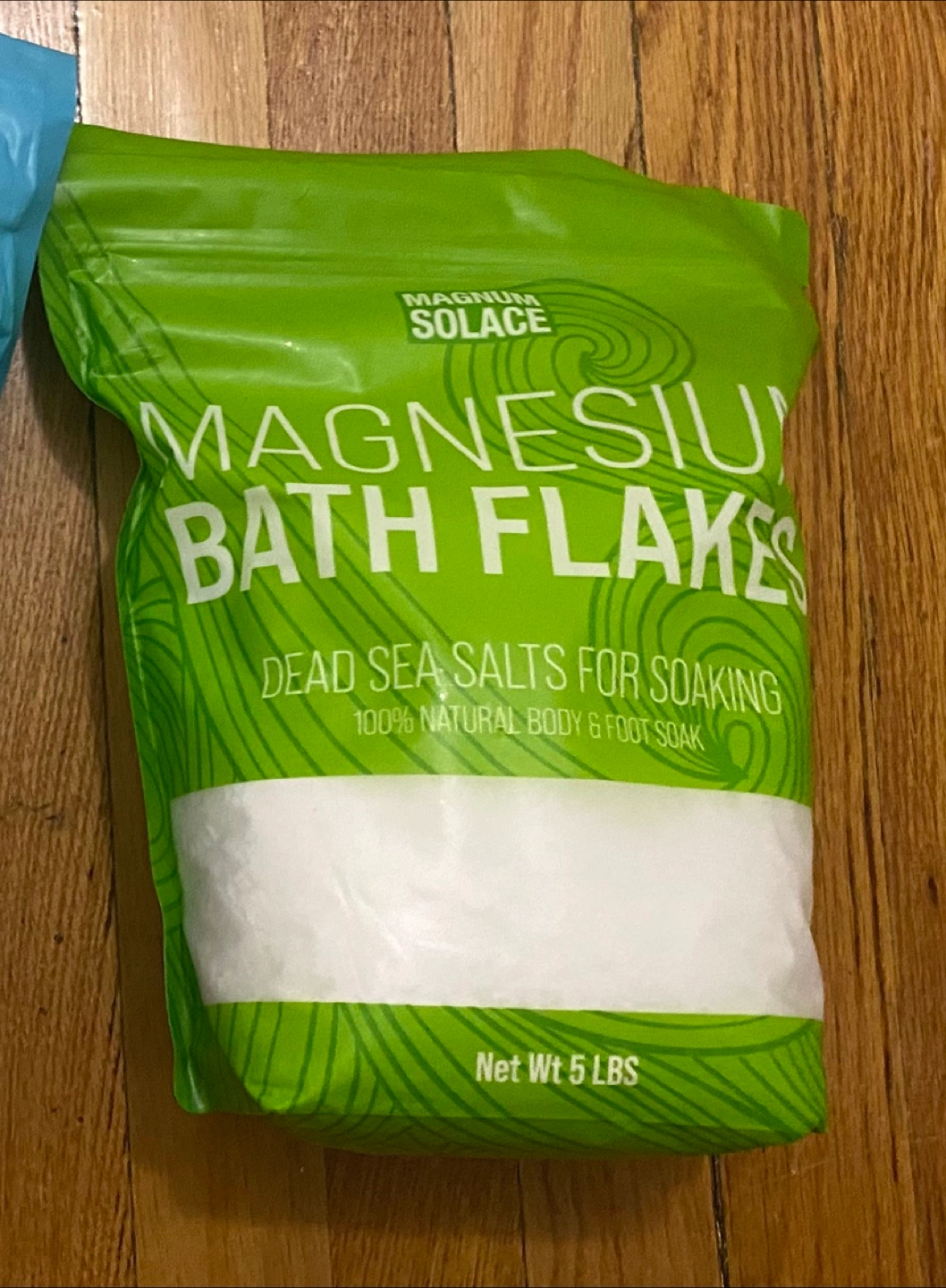 Bag of magnesium bath flakes. Designed for soaking. It is 100% natural and intended for both the body and feet, offering a way to help relax at the end of a long day. 5lb bag.