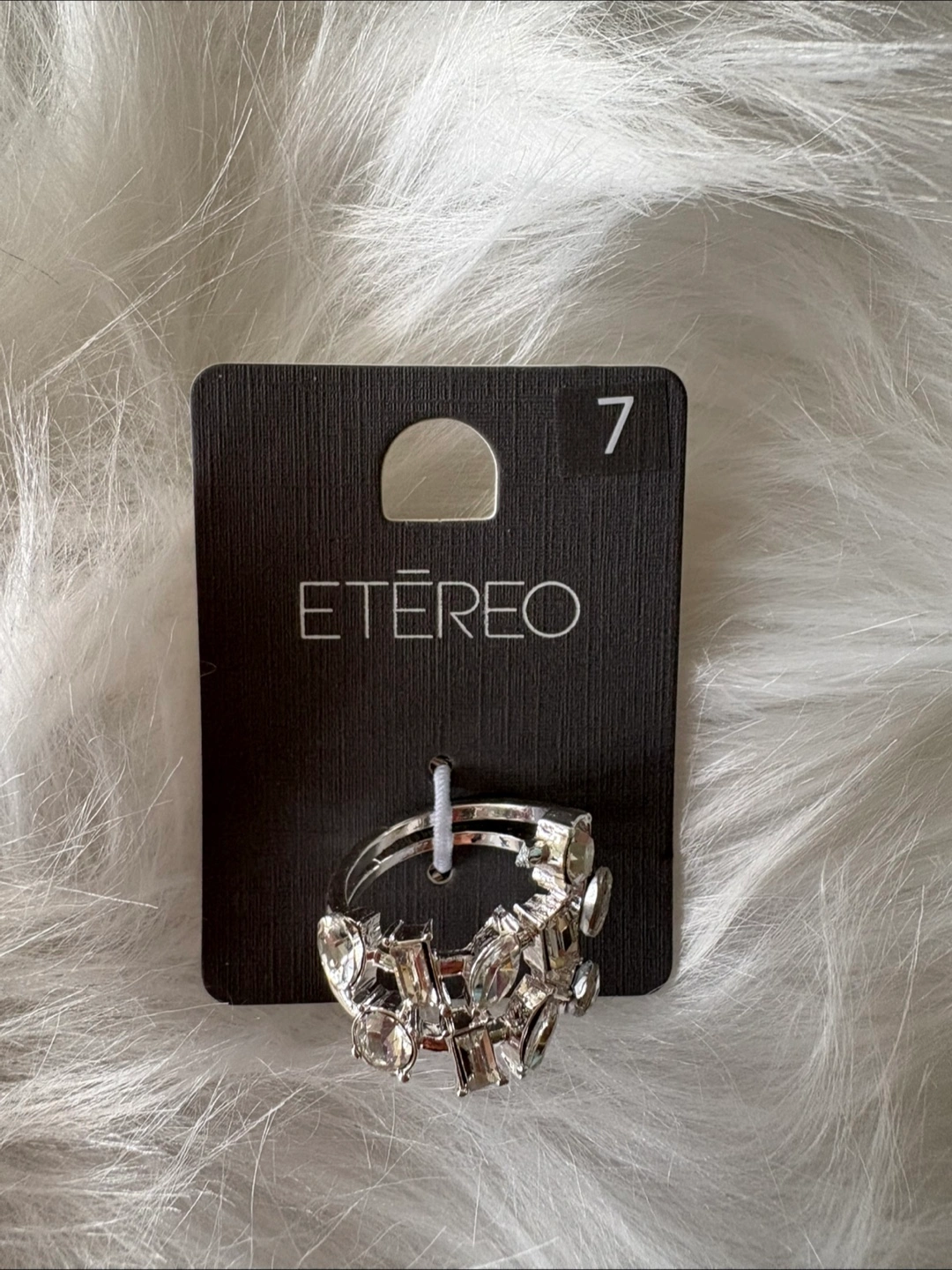 A beautiful silver ring adorned with various gemstones. It appears to be a size 7. This ring would look beautiful on a night out or simply add a touch of sparkle to your everyday look.