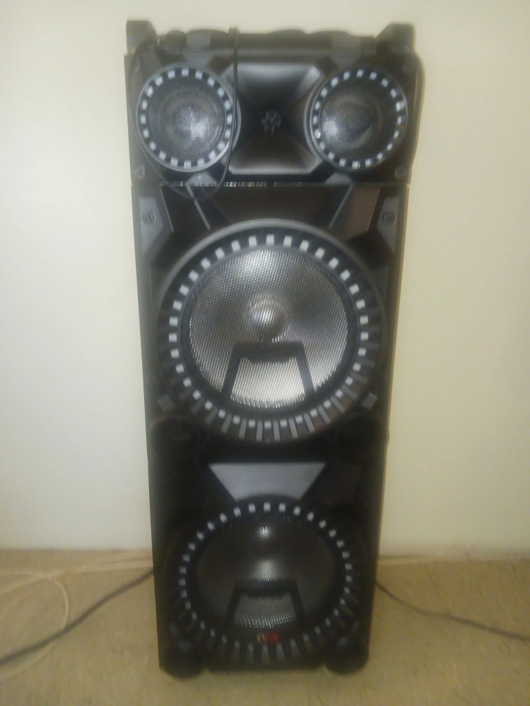 A black tower speaker. Contains three speakers and two smaller speakers on the top. This speaker would be perfect for filling your space with comforting sounds. still works just little static when volu turned all the way top