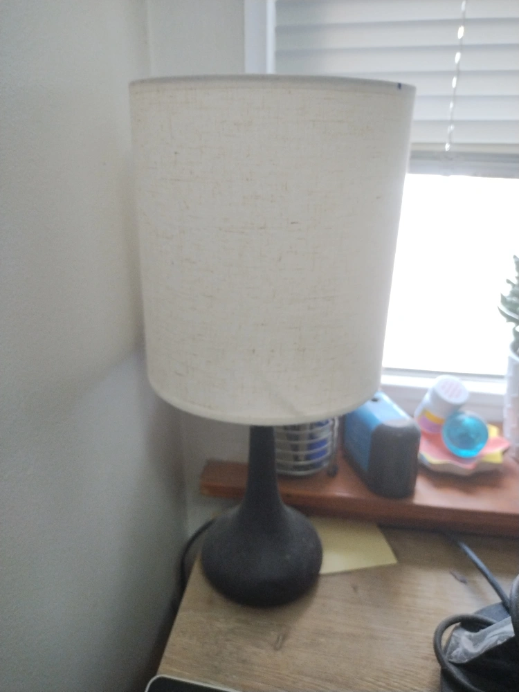 Features a white lampshade and a dark base. The lamp has a cord. Consider this lamp to create a cozy atmosphere in any room.
