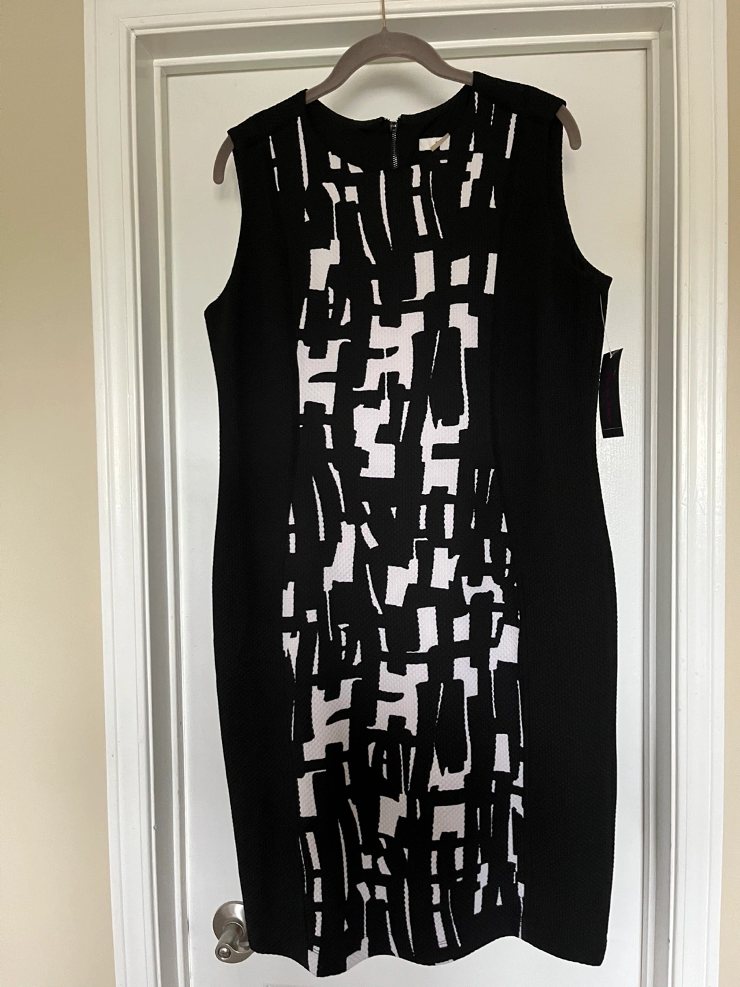 Sleeveless dress. Black with a white print design in the center. A zipper closure at the back. A great outfit for a casual day out or a formal occasion, whatever your heart desires.