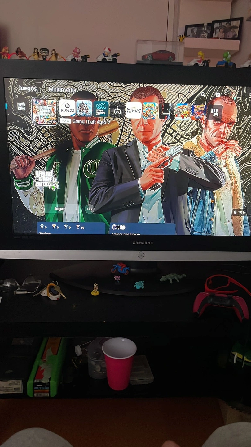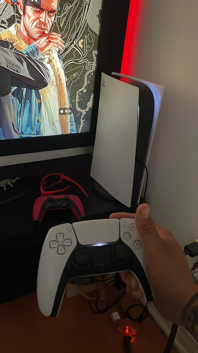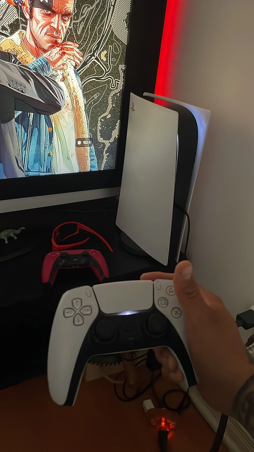 I am selling a PlayStation 5 console with 2 controllers. The console appears white. Included is a regular white controller, as well as a red one. You can relax after a long day by diving into your favourite games.