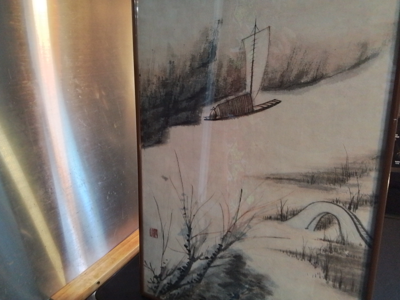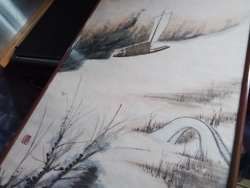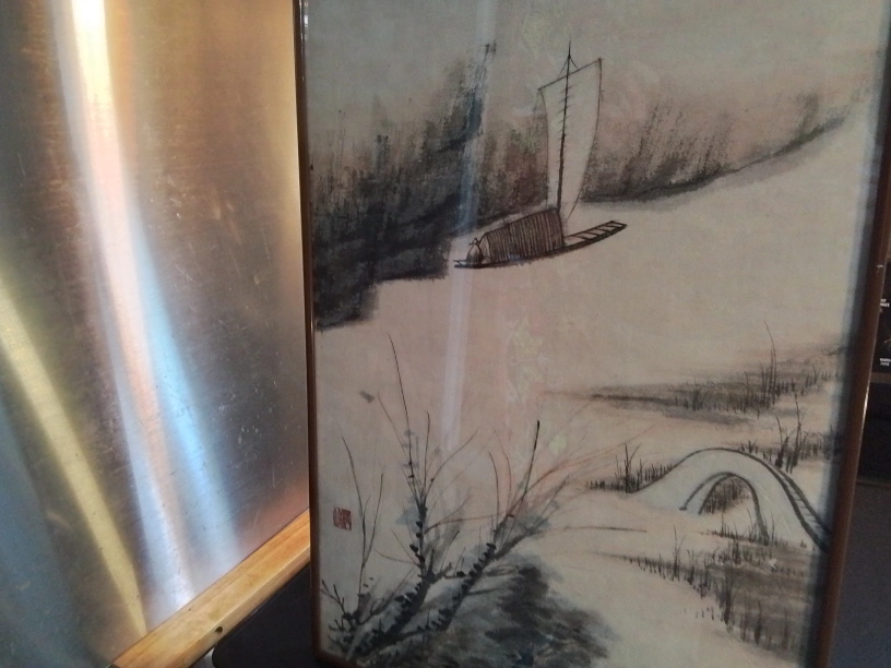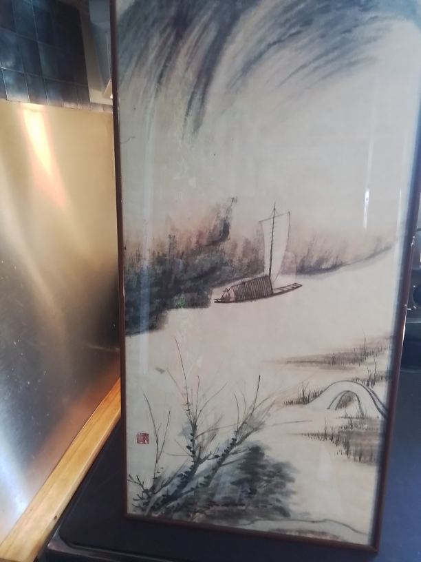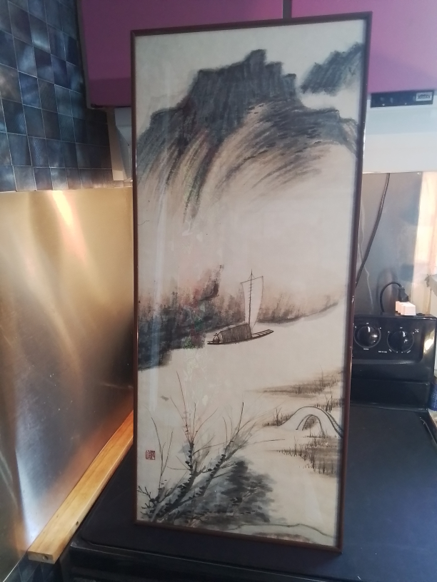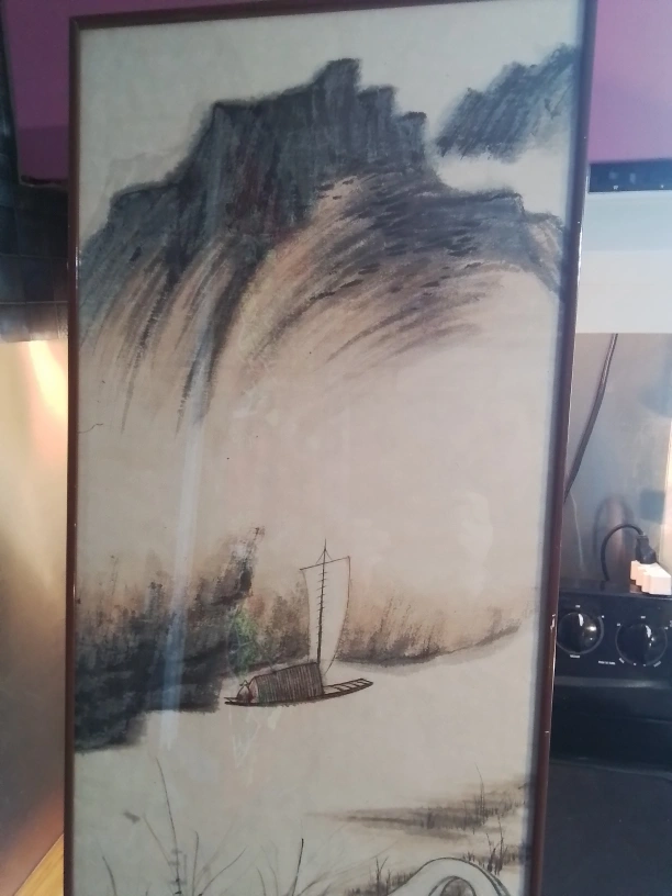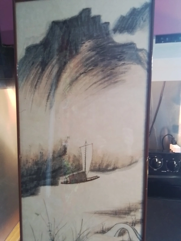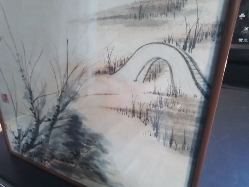 I'm selling an Asian art piece featuring a serene landscape with a boat, bridge, and mountains, all rendered in delicate detail. This artwork brings a touch of Eastern tranquility to any room. It is in used condition, which adds to its vintage appeal.