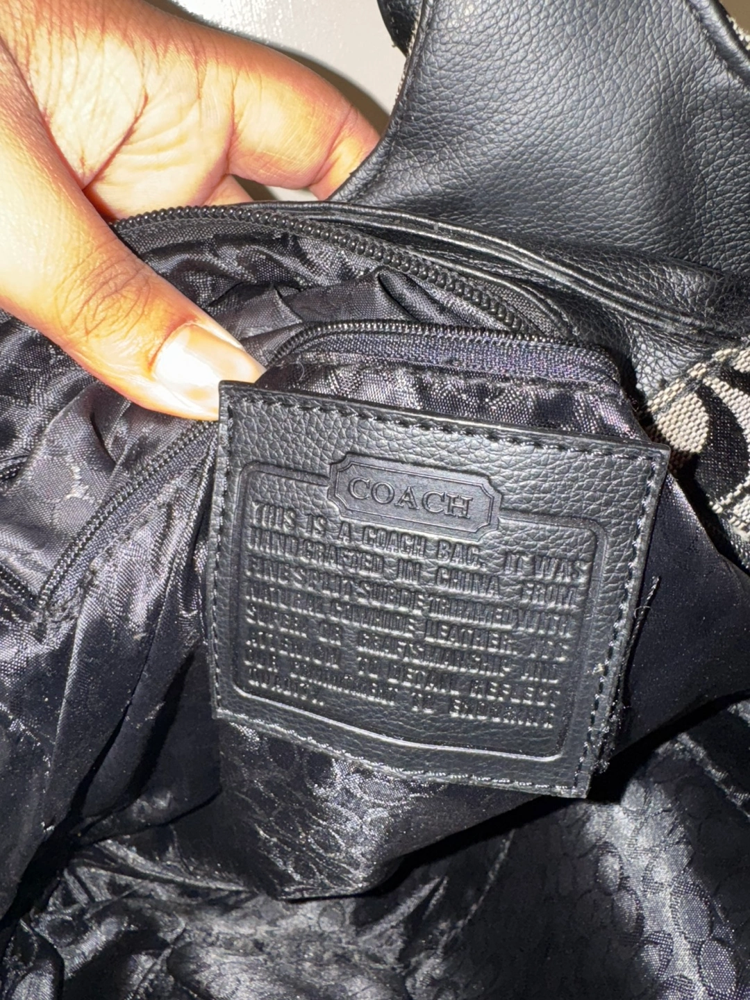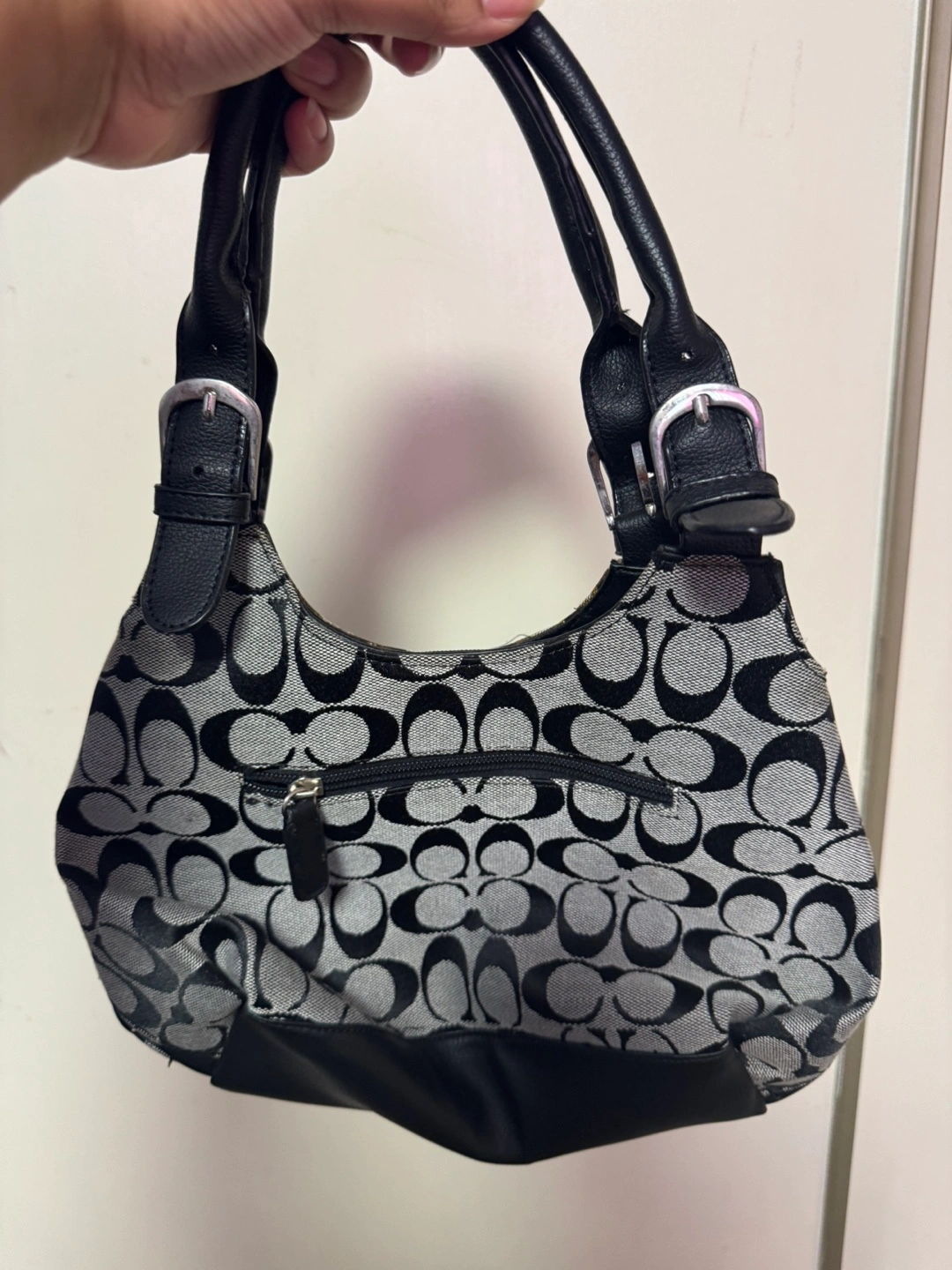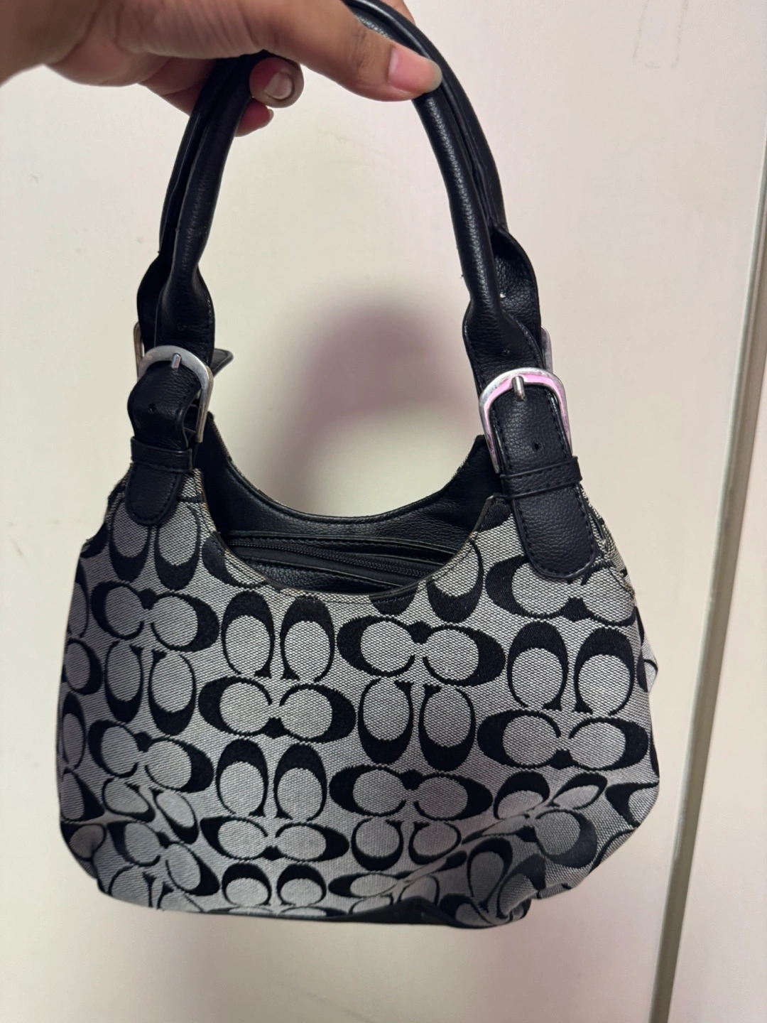A small handbag with a signature pattern. Includes dual handles. The lining appears to be made of a silky material, with a zipper closure. You can use it to store all your essentials to make you feel prepared.