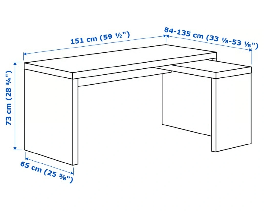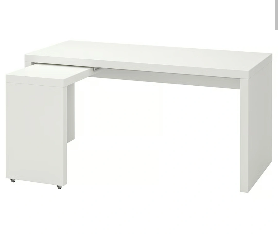 Ikea Malm White Desk with a pull-out section. The desk is of a modern design. The sliding section is on wheels. There is a panel along the back with space to hide cables.
