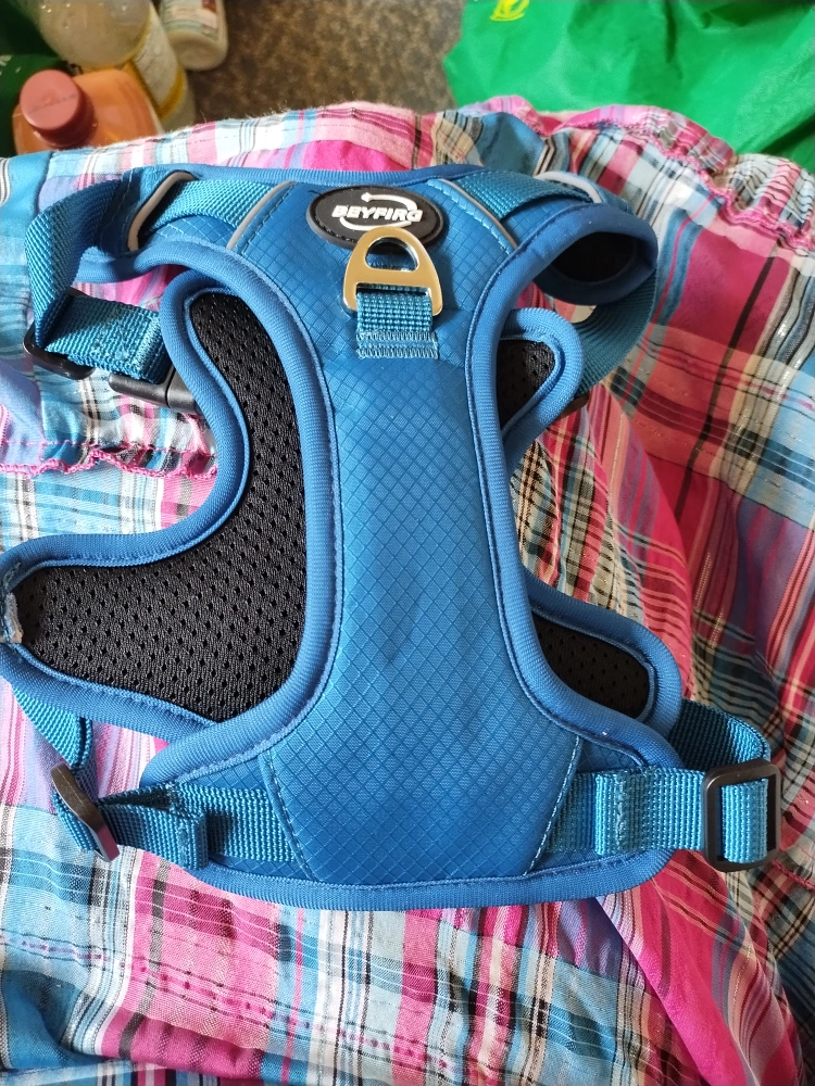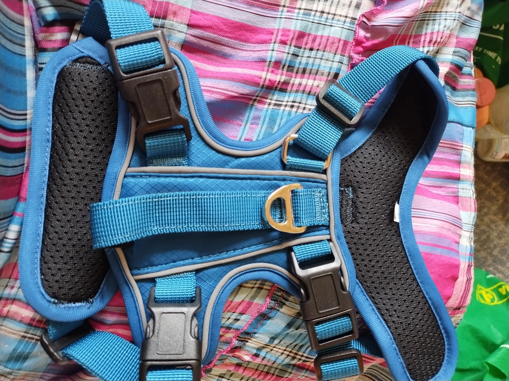 A blue harness for a dog. Features adjustable straps and a breathable design. Will make your walks with your furry friend a breeze. Anti pull harness, size small.