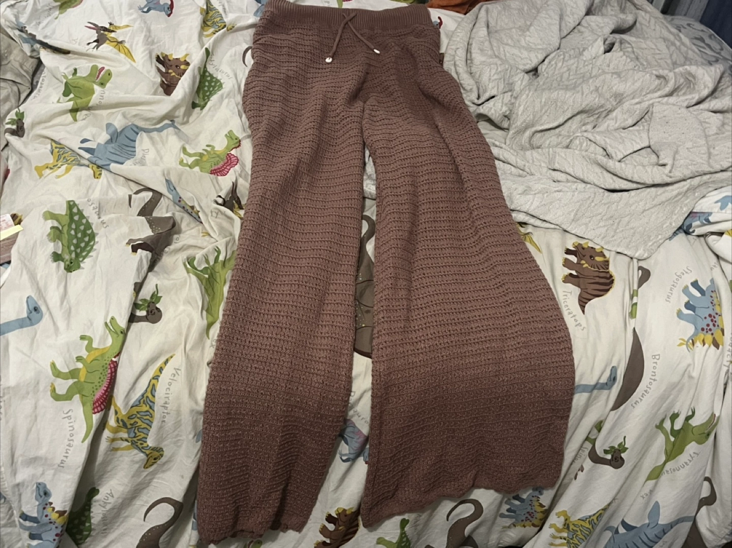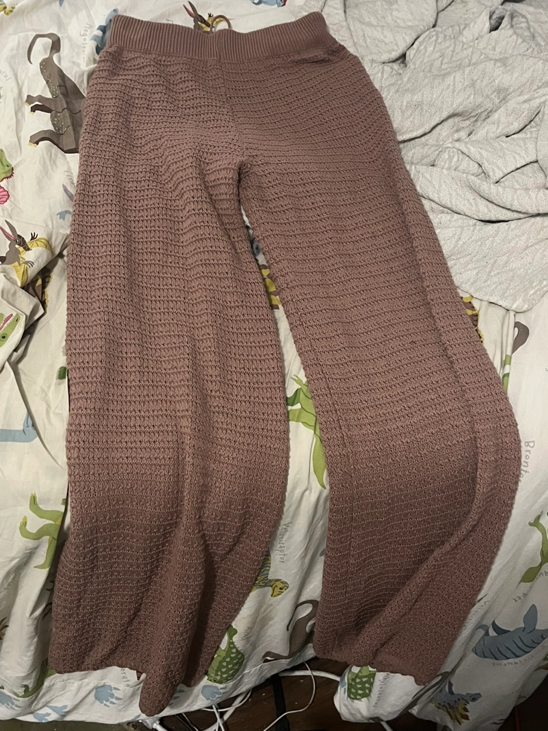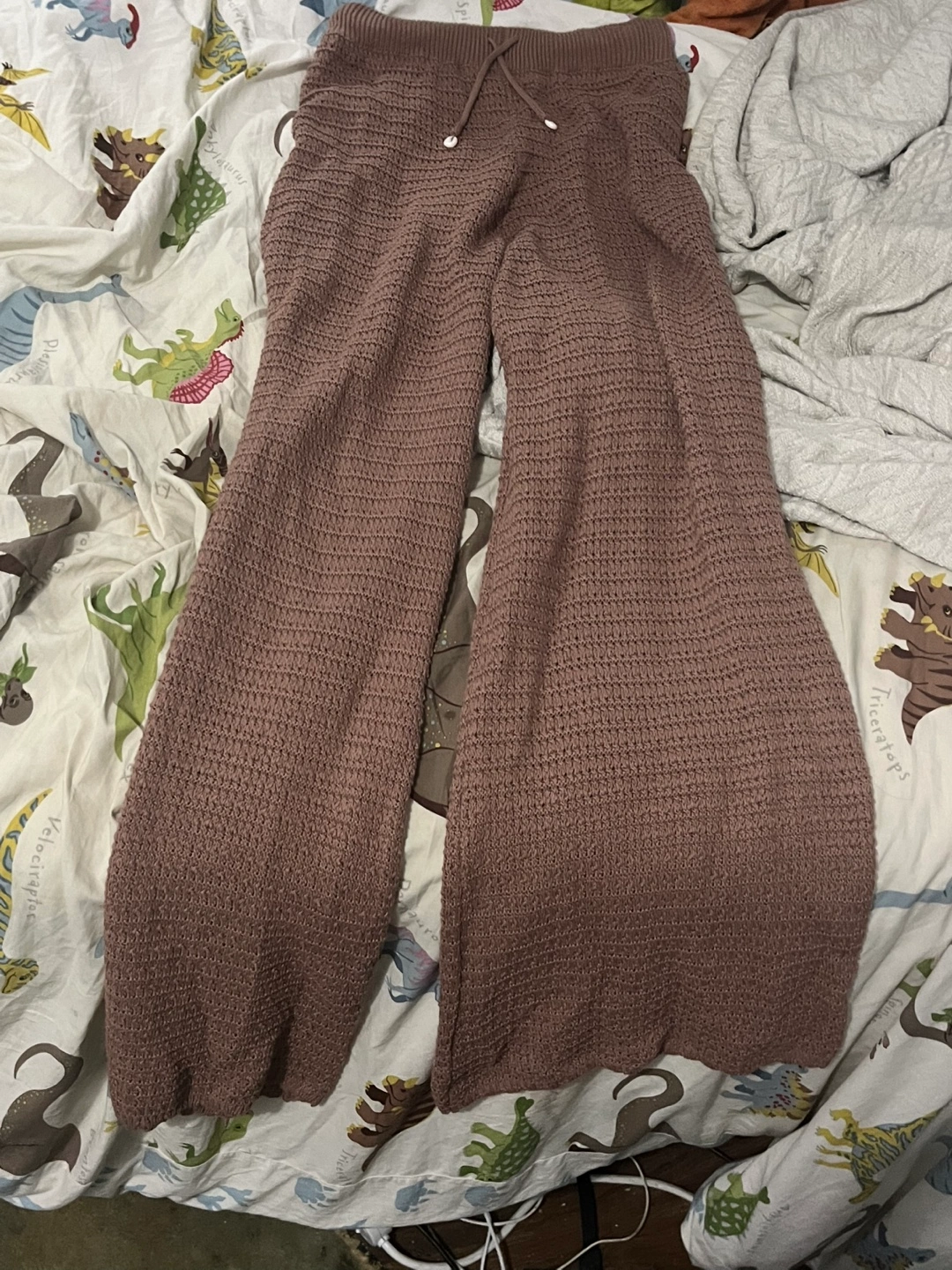 Cozy wide leg knit pants. Features a drawstring waistband. Perfect for lounging around after a long day. Size large but fits like a medium.