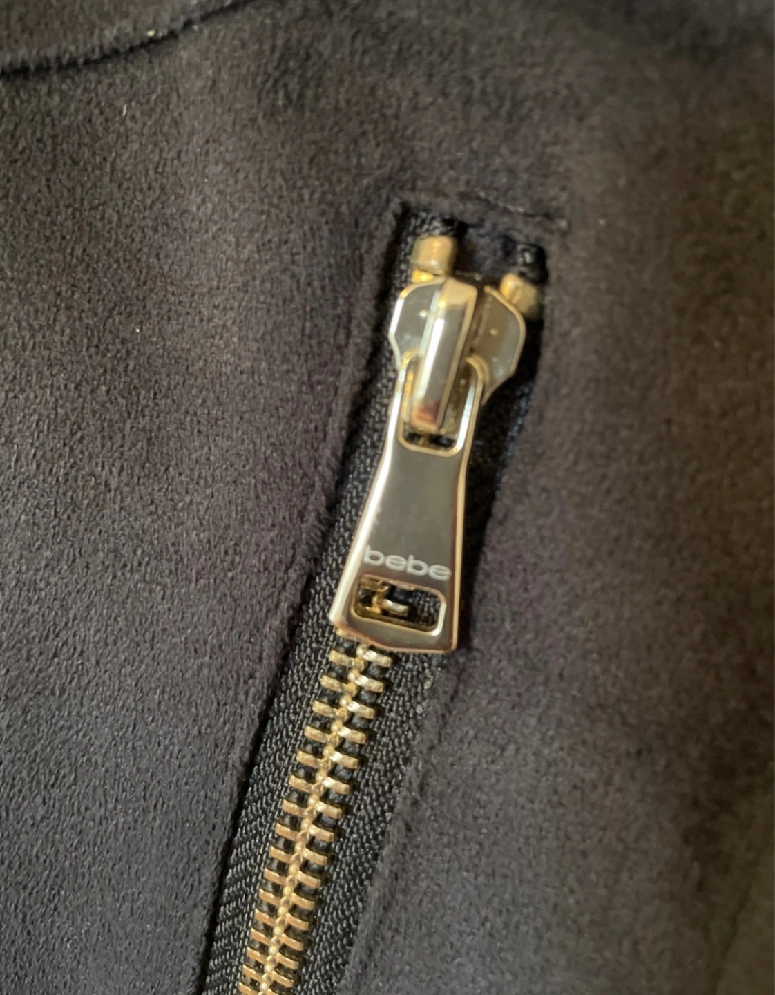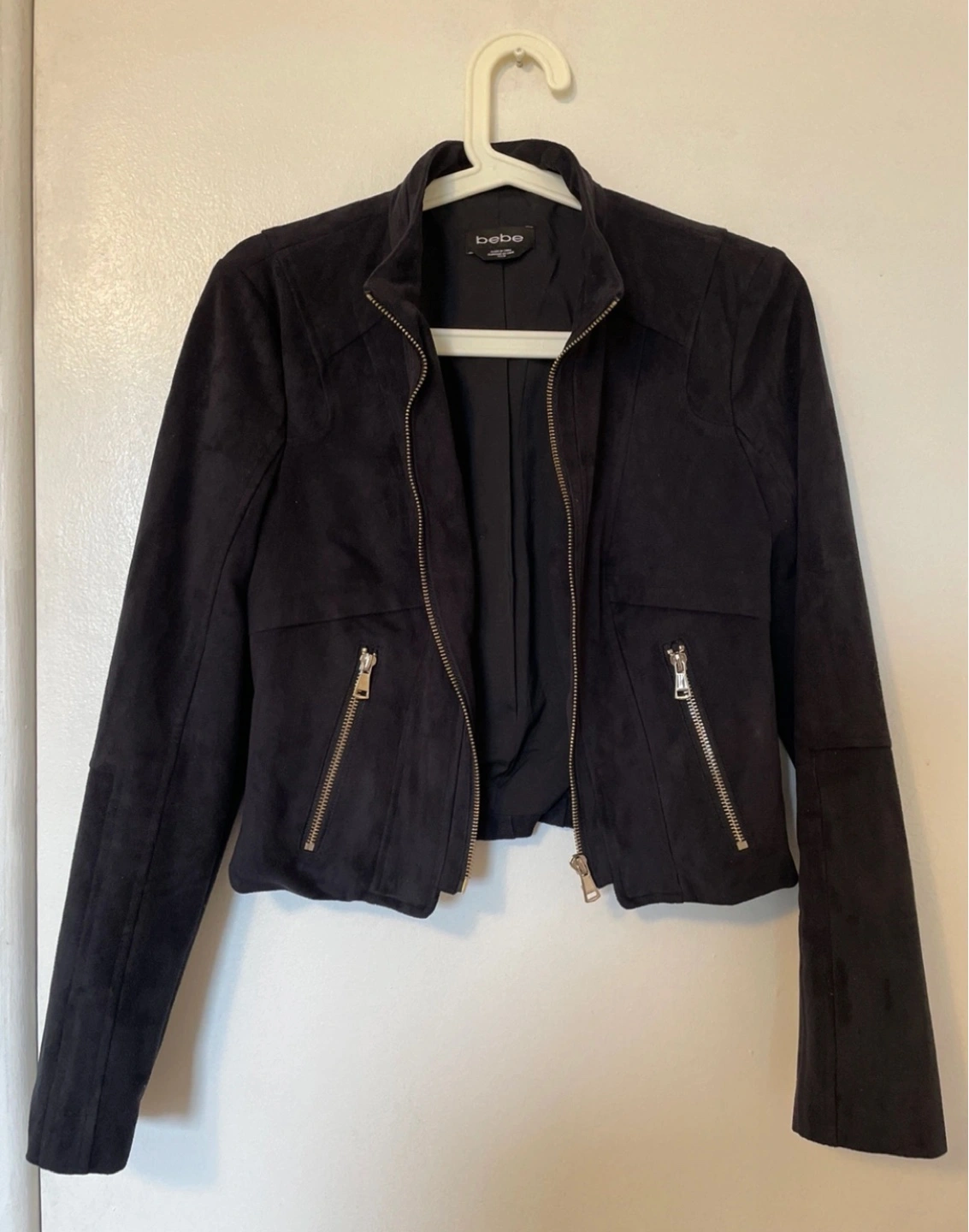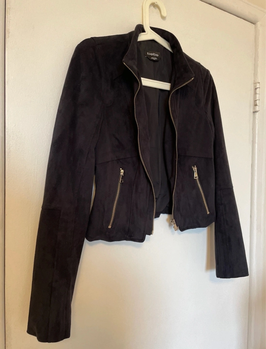A black faux suede jacket with a zipper closure. The jacket has long sleeves and pockets. Great for layering, it's the perfect addition to any wardrobe. Excellent condition. No pets, non smoking home.