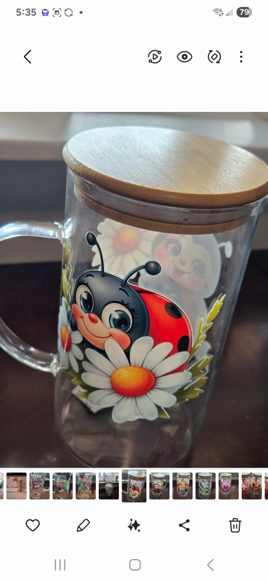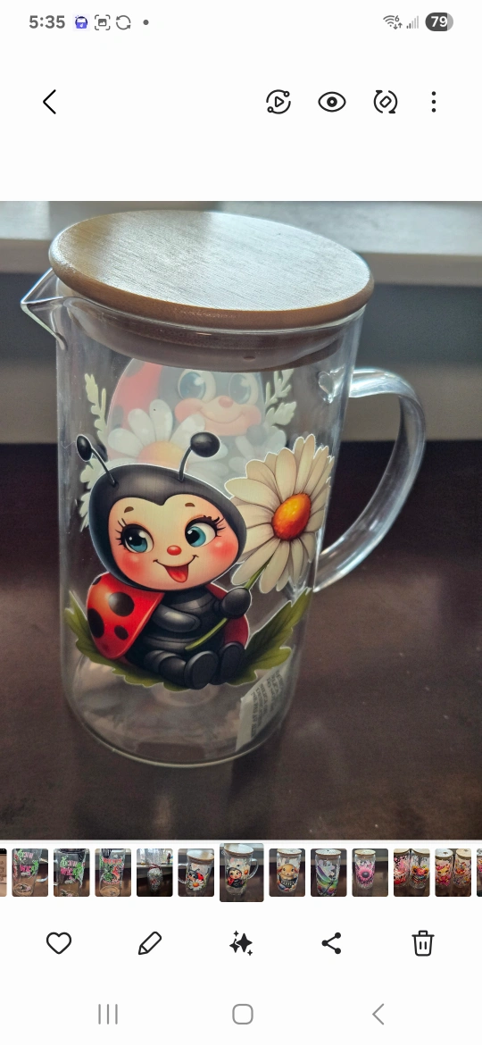 A clear glass pitcher. Adorned with a ladybug and daisy graphic. Comes with a wooden lid and a handle. A perfect way to enjoy your favourite iced tea.
