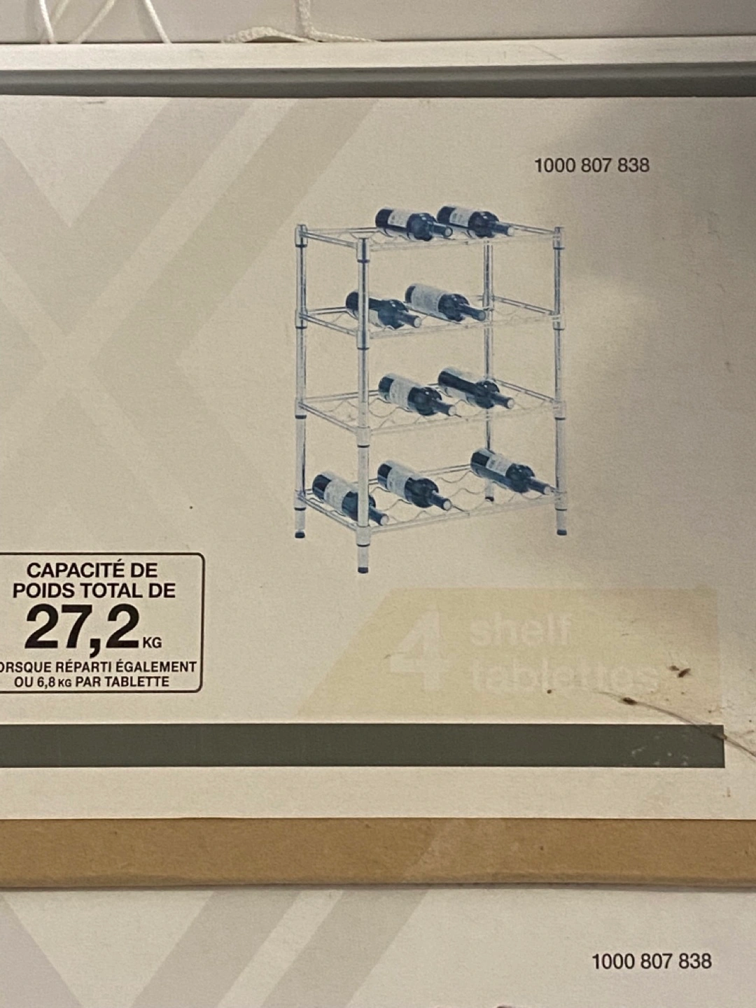 One set of wine racks. Features four shelves. Can store multiple bottles. Perfect for organizing your favorite wines. $15 each box.