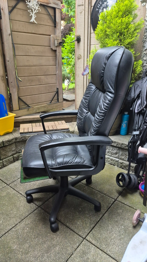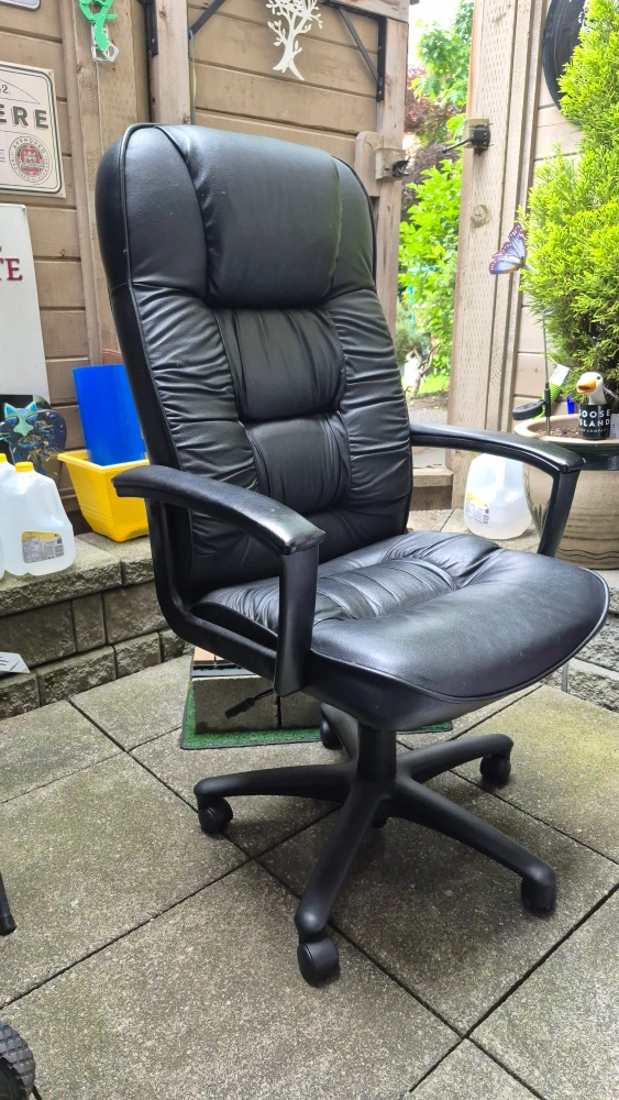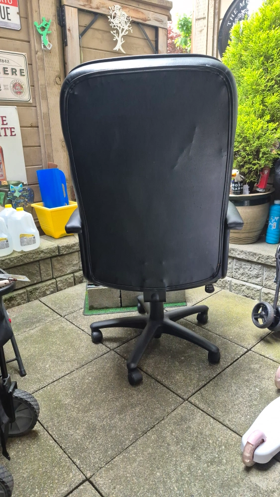 Black swivel recliner chair with a high back. Features armrests and a five-star base with wheels. This chair would be perfect for long hours spent at your desk.