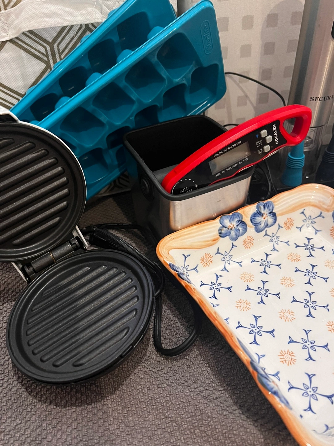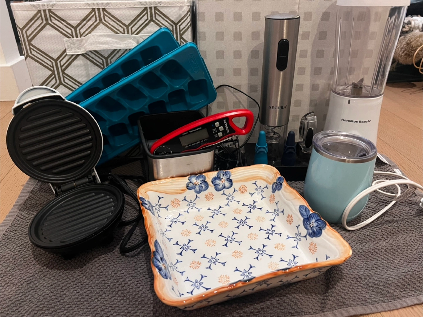 Selling a collection of kitchen essentials. Includes a small grill, ice cube trays, a digital thermometer, a mini blender and automatic wine opener.
