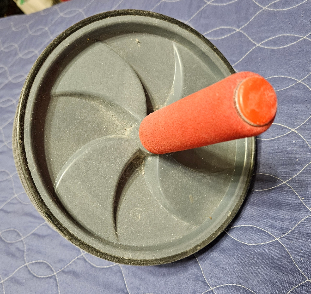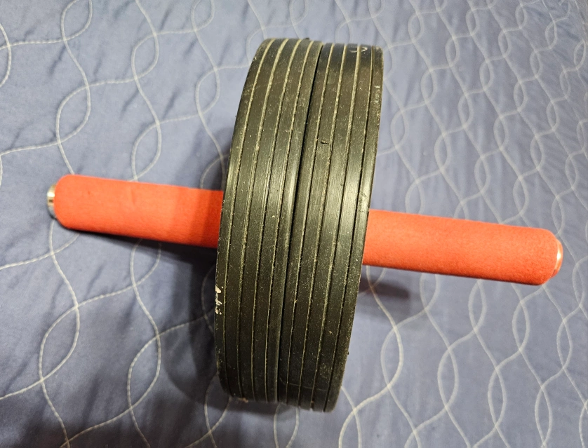 An exercise wheel with a center rod and two handles. The wheel appears to have a tire-like texture. Handle grips are red in color. The handles are padded for grip comfort, perfect for your workout.