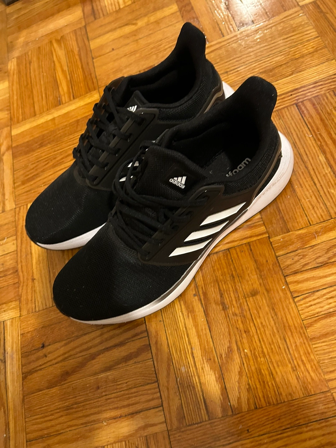 Black athletic shoes. White sole. White stripes down the sides. A great pair of shoes to relax in after a long day. Mint condition. Worn once