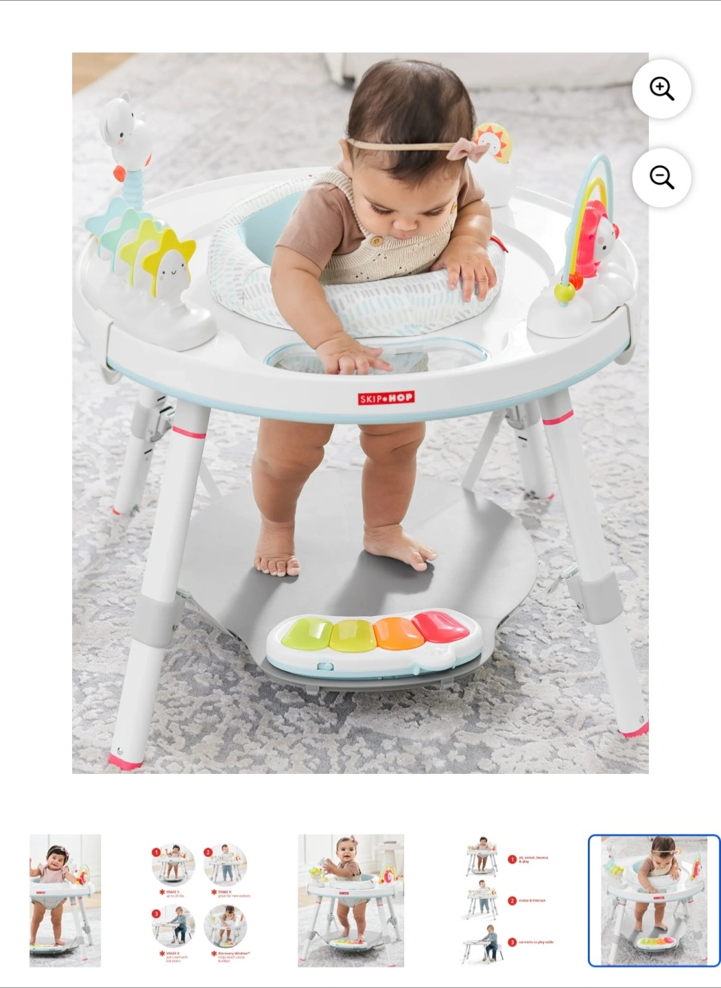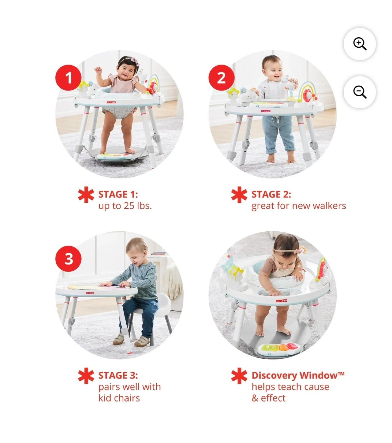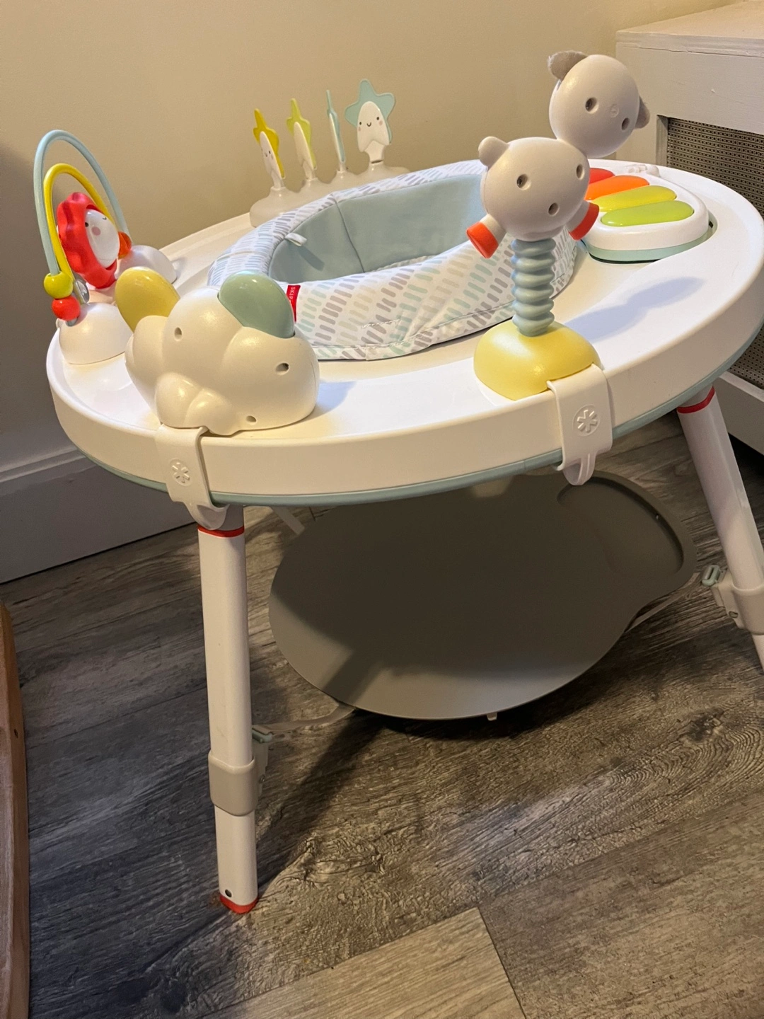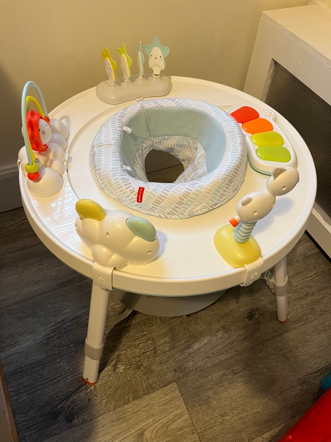 Activity center featuring interactive toys. The center has a padded, rotating seat. Includes toys and an activity platform. You can use this center to keep your little one entertained while you get things done around the house. Converts to a table when they outgrow the activity center. Comes with all original pieces and can begin to be used from the age of four months and up. Retail price $141, Cash only!