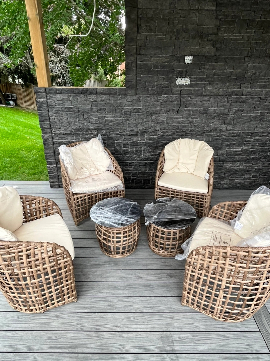 Four chairs and two side tables. Wicker finish, natural color. Chairs include seat cushions. Side tables have a dark surface. Perfect for unwinding after a long day.