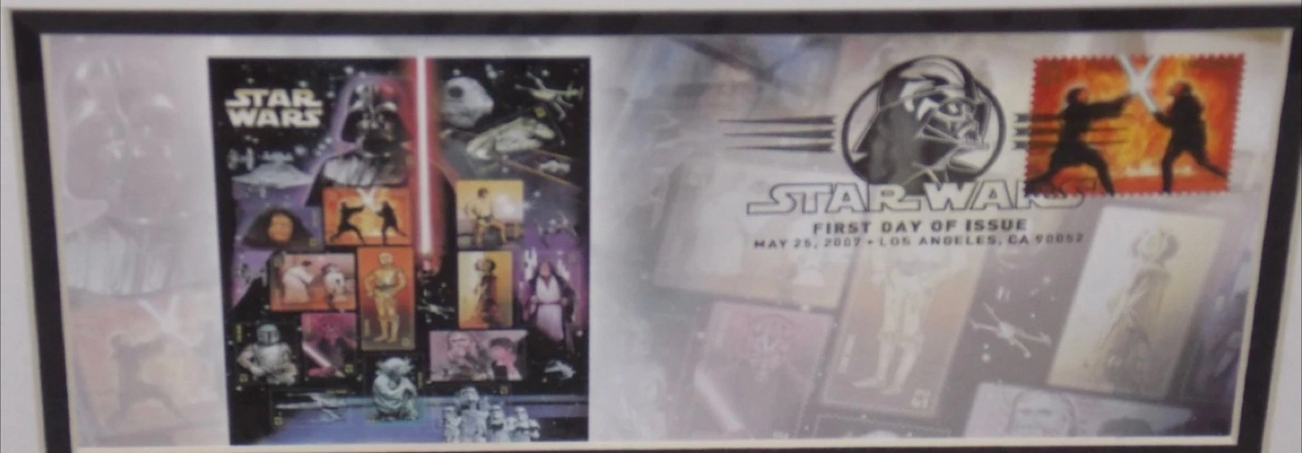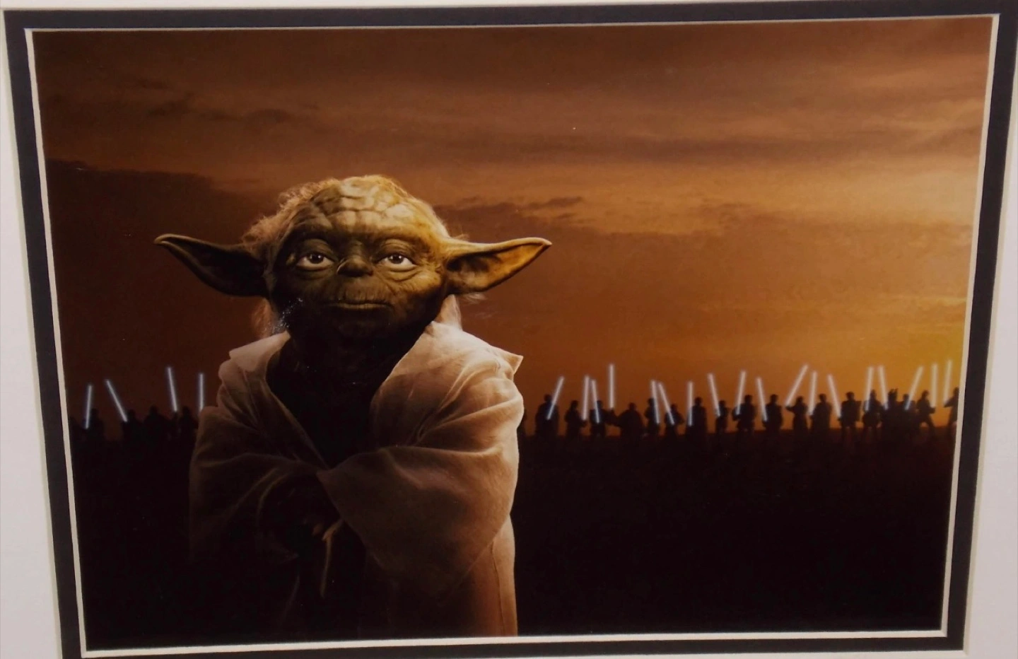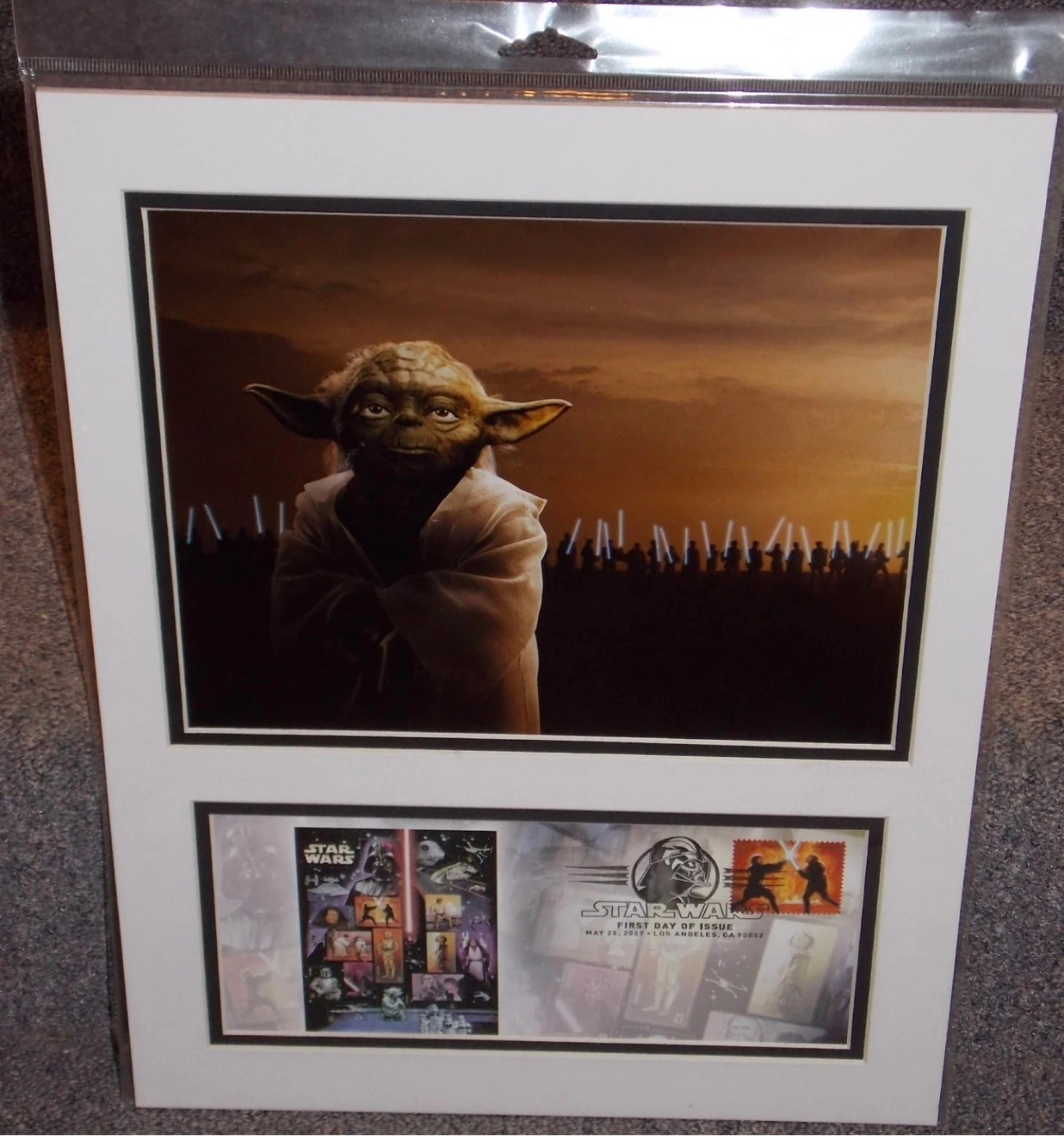 A Star Wars print featuring Yoda, with some stamps underneath. I hope that this print will bring you peace and enjoyment.