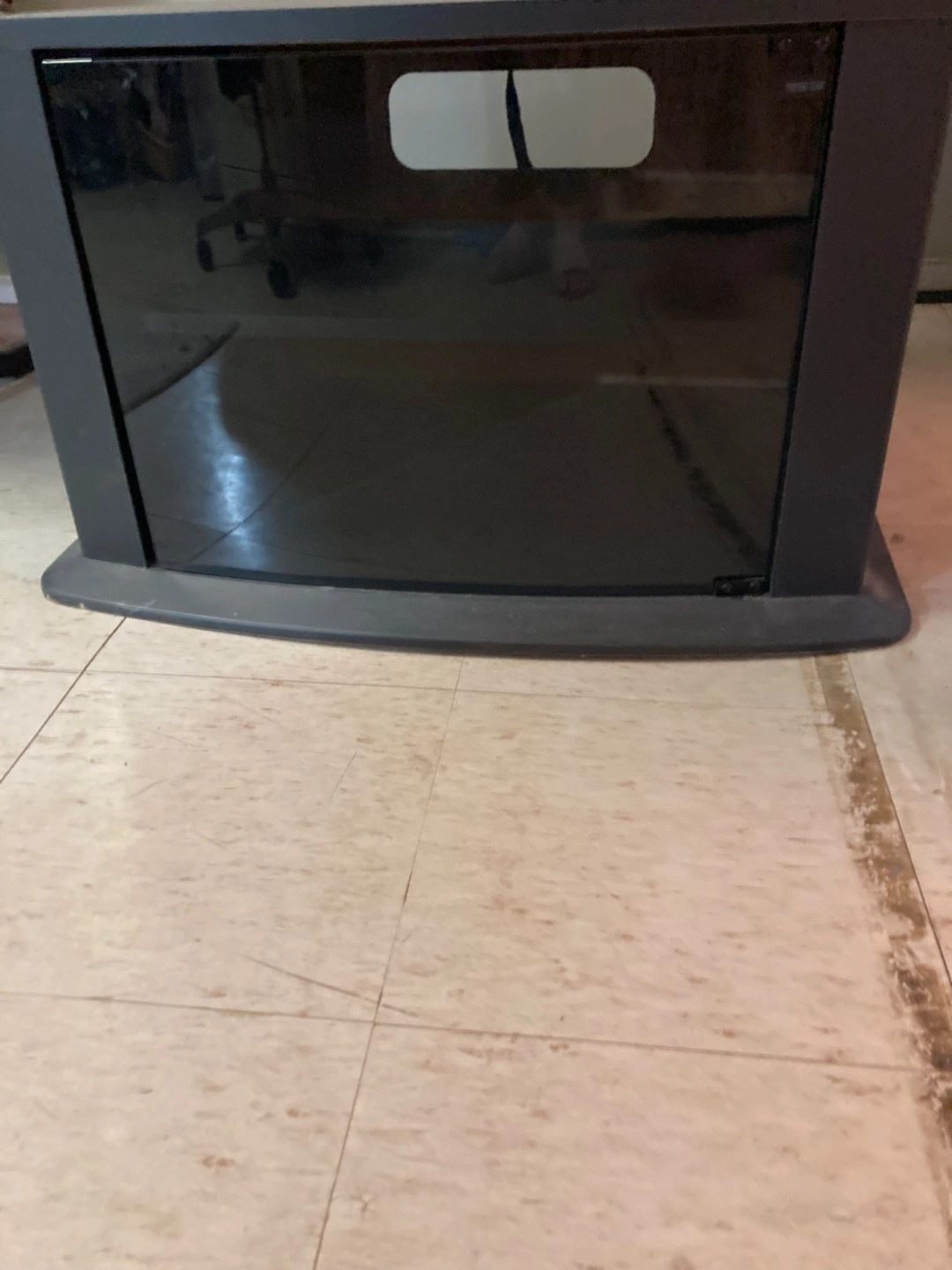 Black media console. Glass door with a curved base. Features a shelf inside. Includes a cable management feature. Perfect for creating a cozy and organized entertainment area.