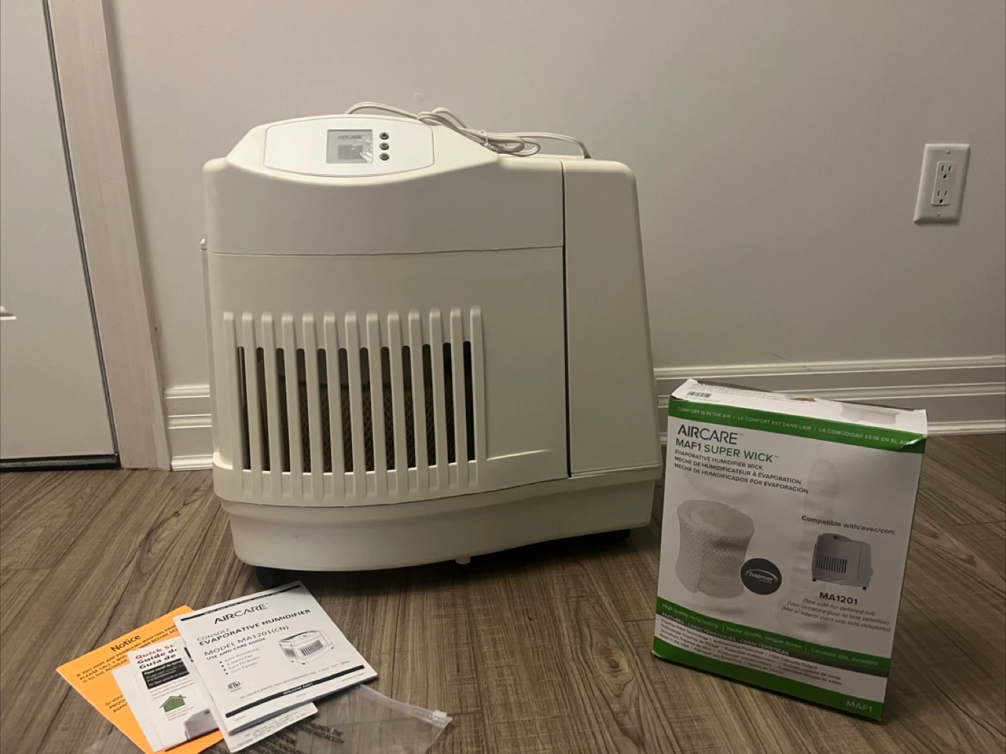 Evaporative humidifier with a digital display. Comes with a replacement wick, user manual, and other accessories. Use it to enjoy a better night's sleep.