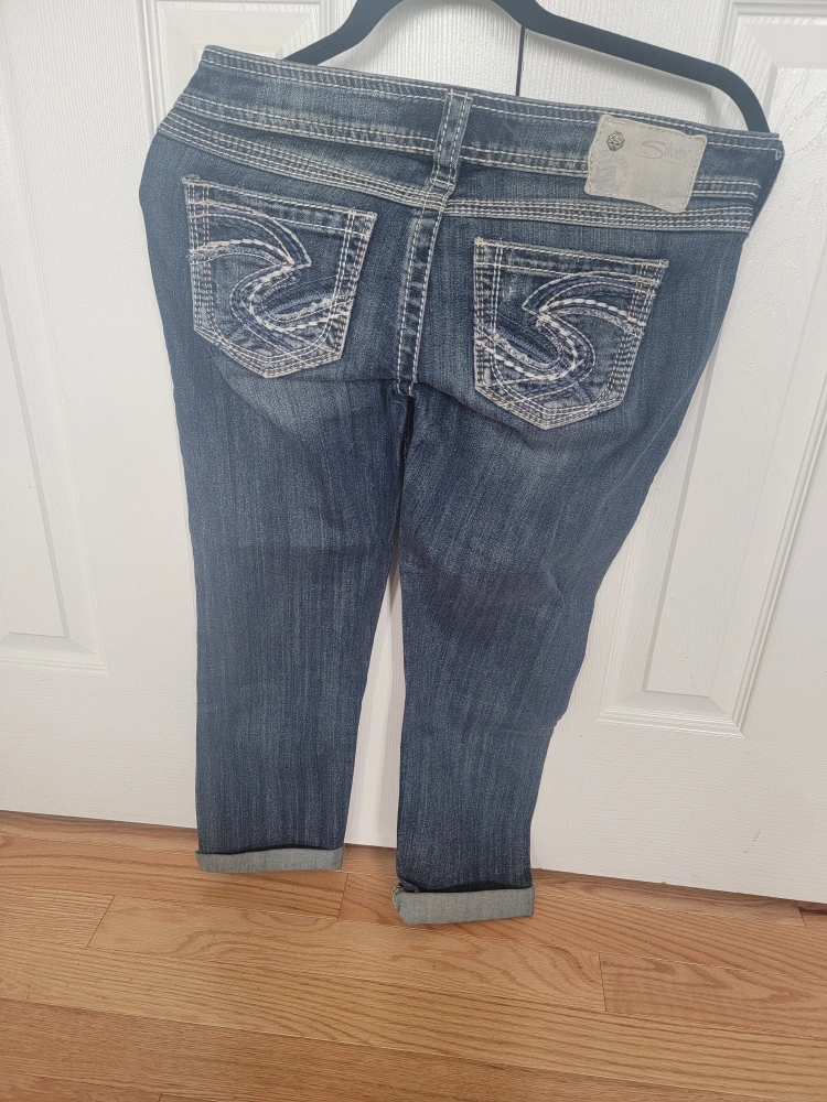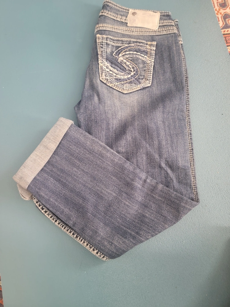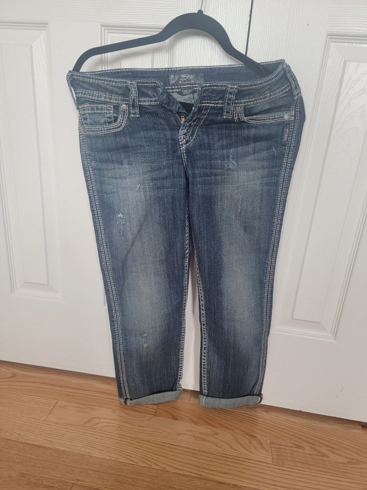 These denim jeans appear to be a comfortable fit. Lightly distressed. With white stitching detailing. Features pockets at the front and back. These jeans are perfect for a relaxing afternoon walk.