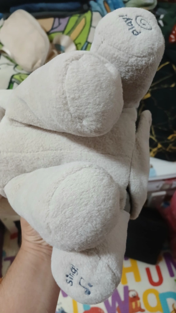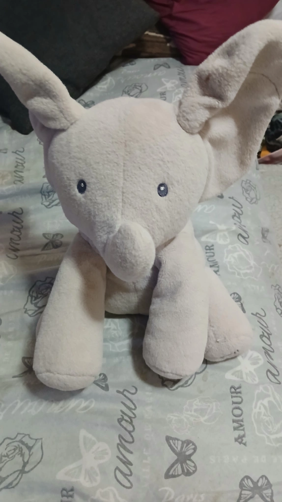 Soft, plush elephant toy. Features large ears and a trunk. Could be a cuddly companion for anyone needing a bit of comfort.also the feet's one that sing (Do your ears hang low while the elephant ears flaps the other feet is a peek a boo which is stinky cute my little one loved it and laughed. the ears also does flaps like it closes it eyes looking for you and opens up. we have 1 and the other was lifted to us but we already have 1.