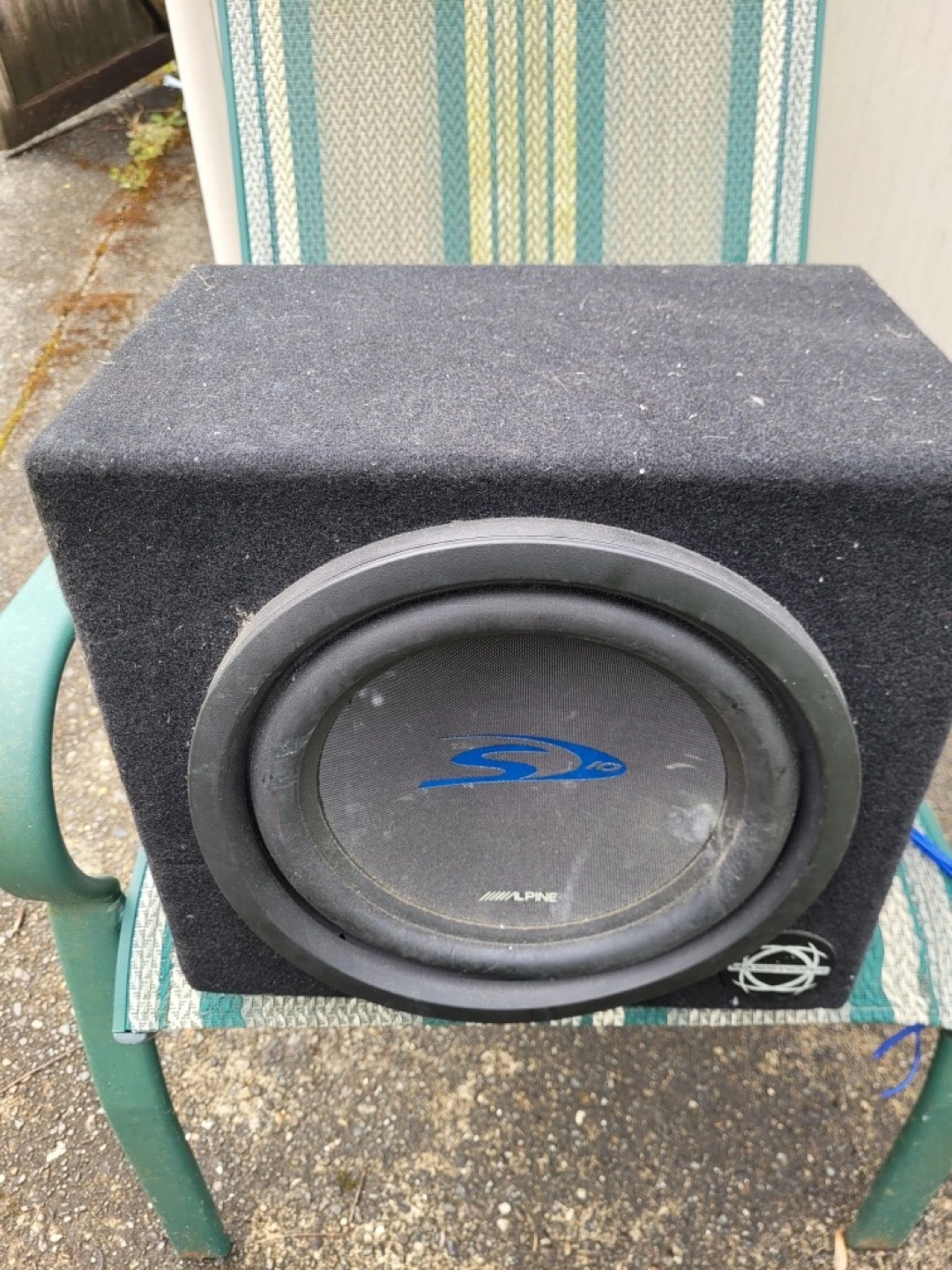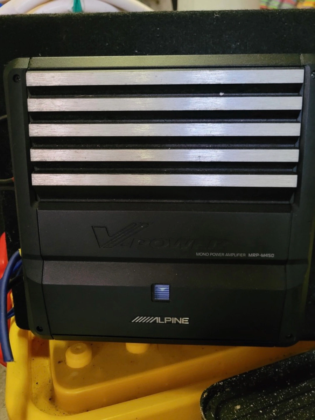 Black rectangular speaker box. Blue Alpine logo on the speaker. V-Power mono power amplifier. An amazing sound system to soothe your soul with some favourite tunes.