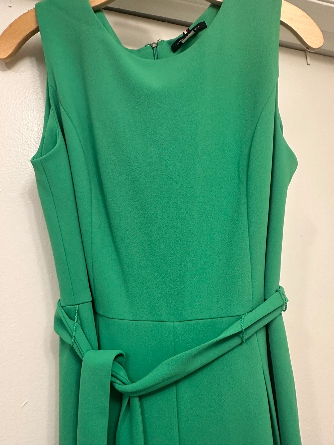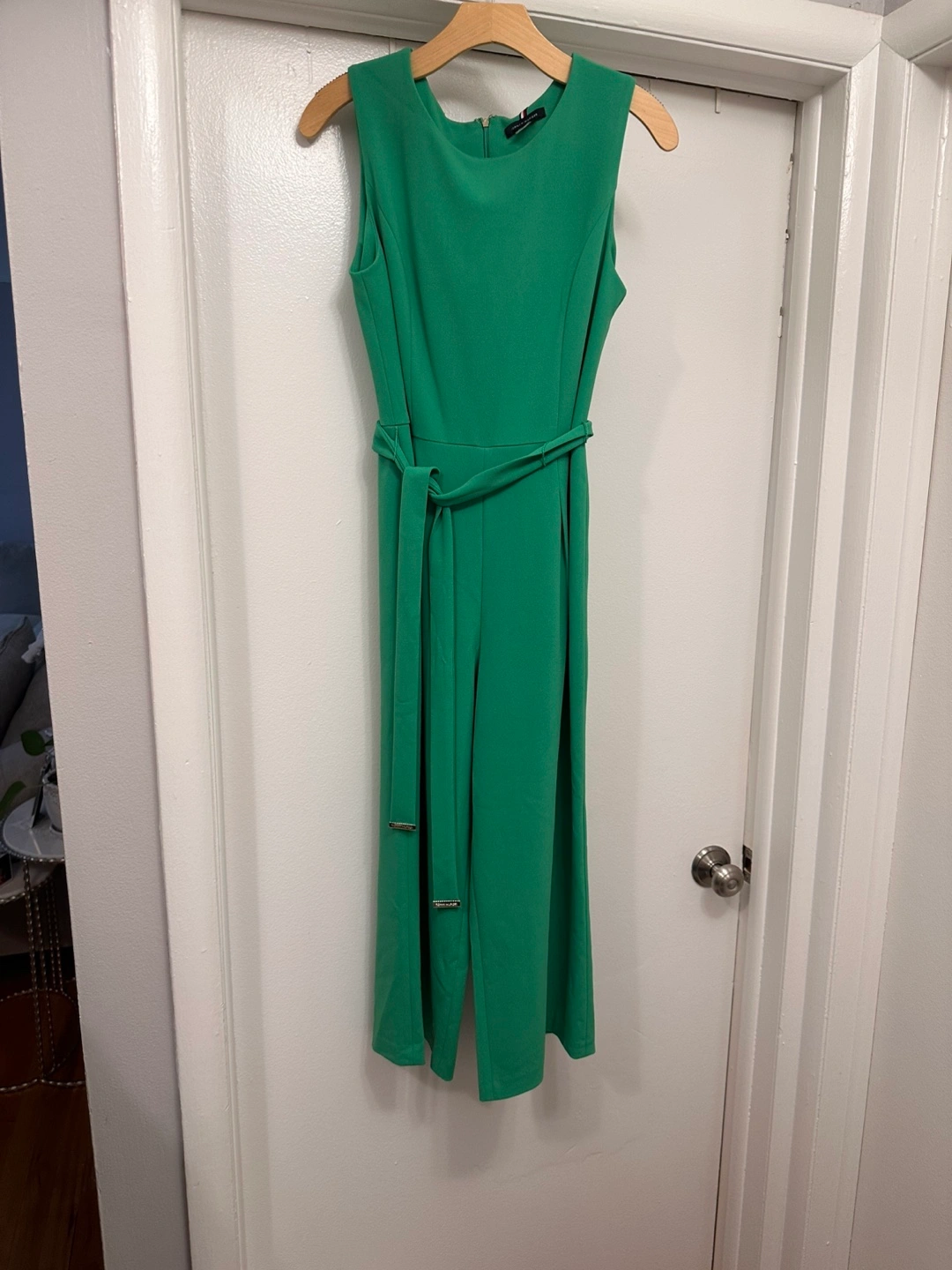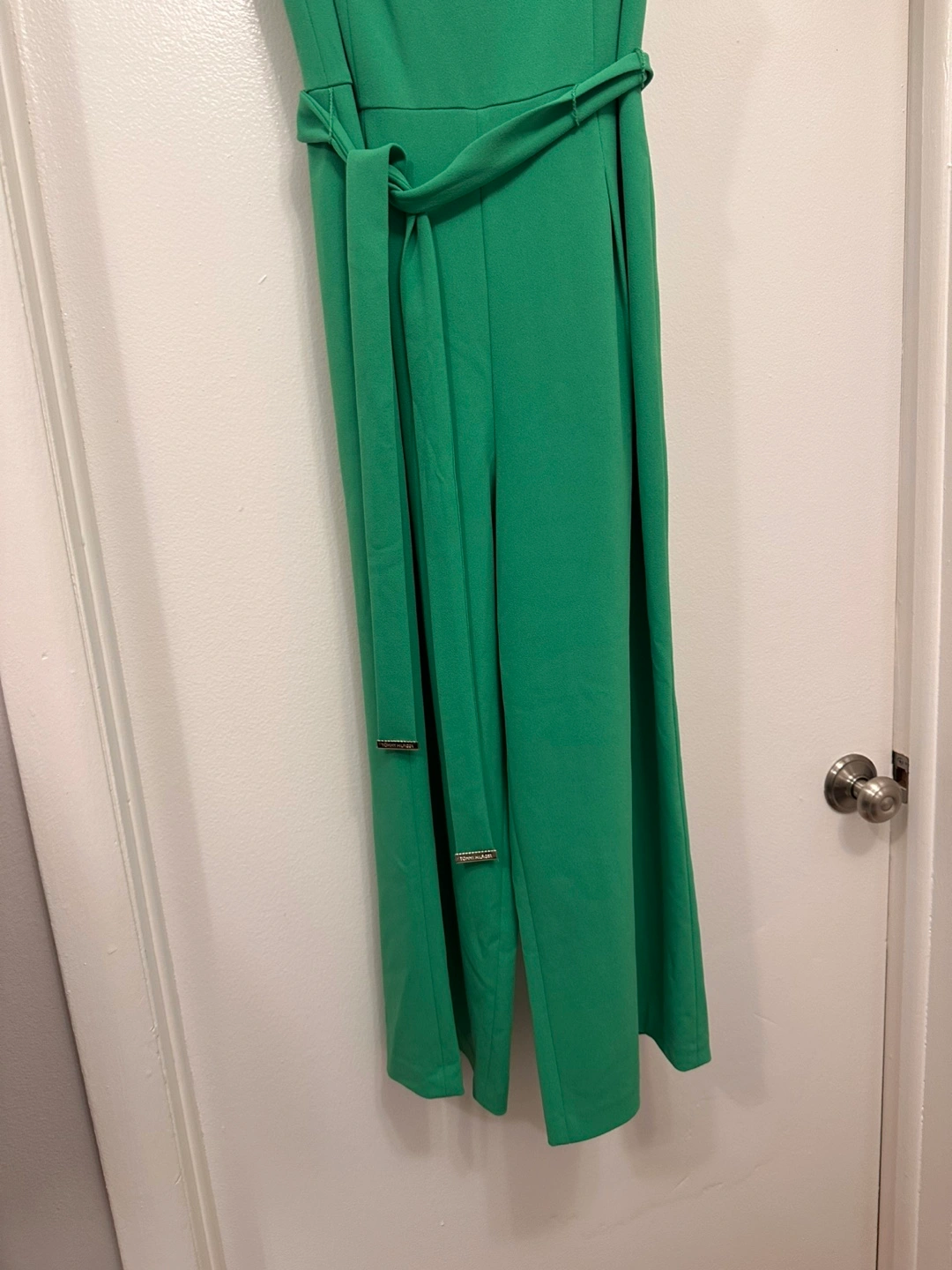 Sleeveless jumpsuit. Solid green color. Features a matching waist tie. Perfect for a summer event or a special occasion, this jumpsuit provides both comfort and style.
