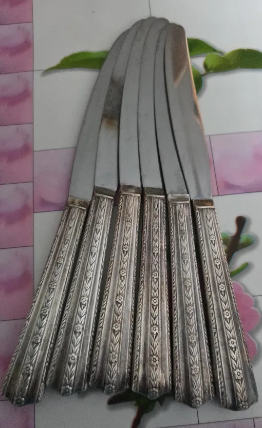 6 Silver knives with detailed handles. The blades are wide and rounded. Consider using these for special occasions, or when eating a comforting meal.