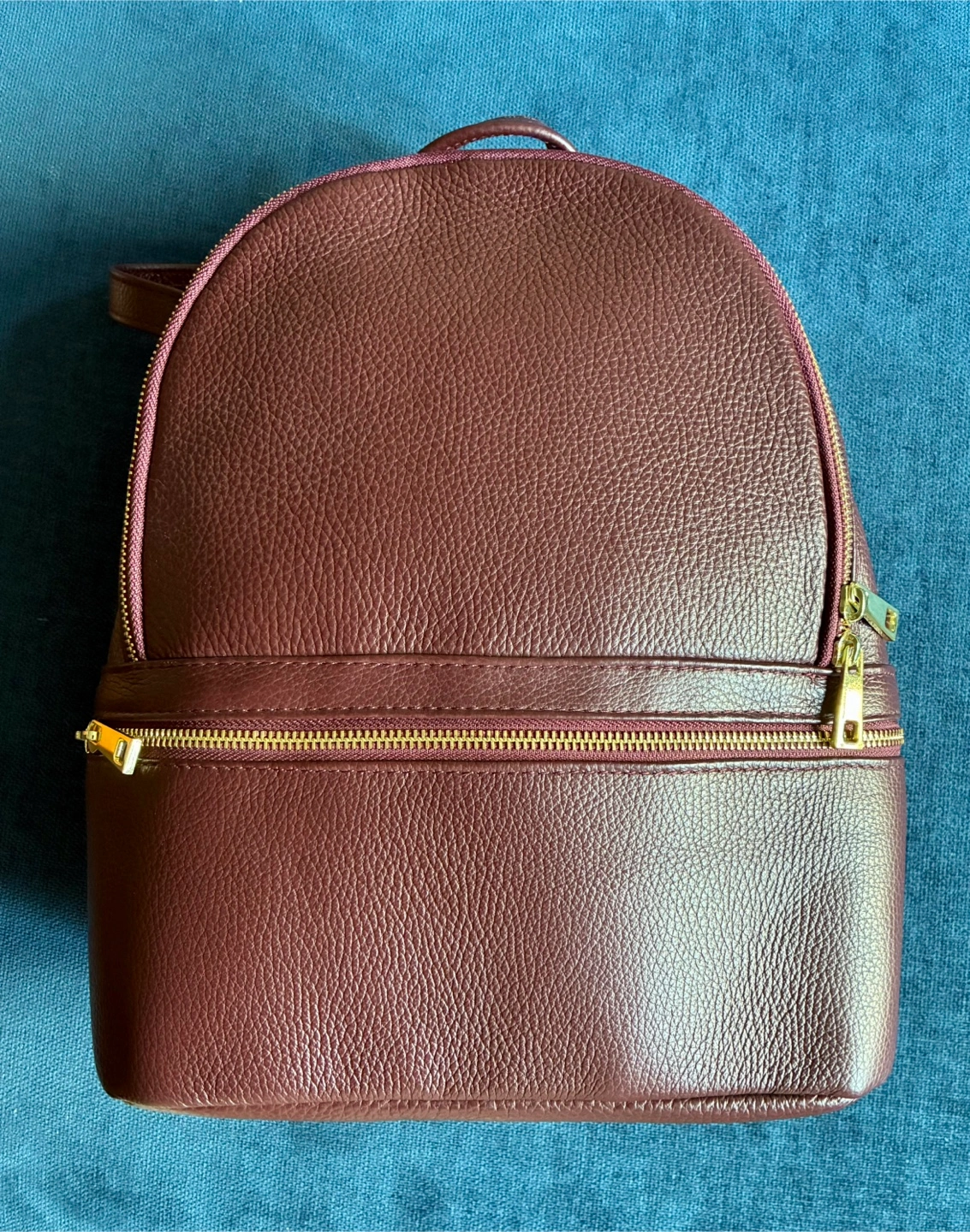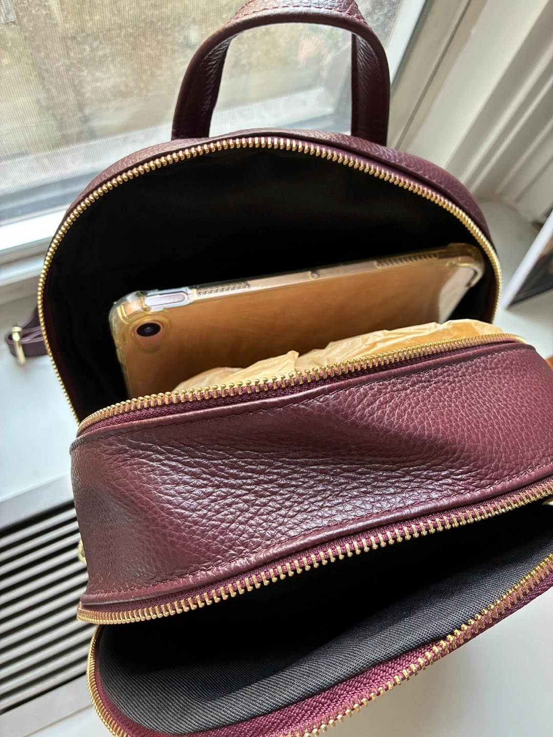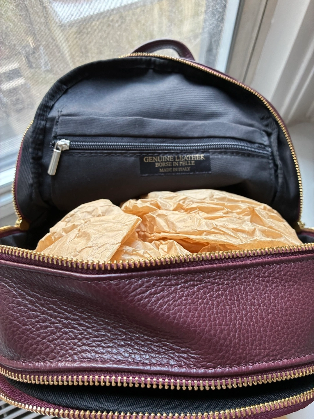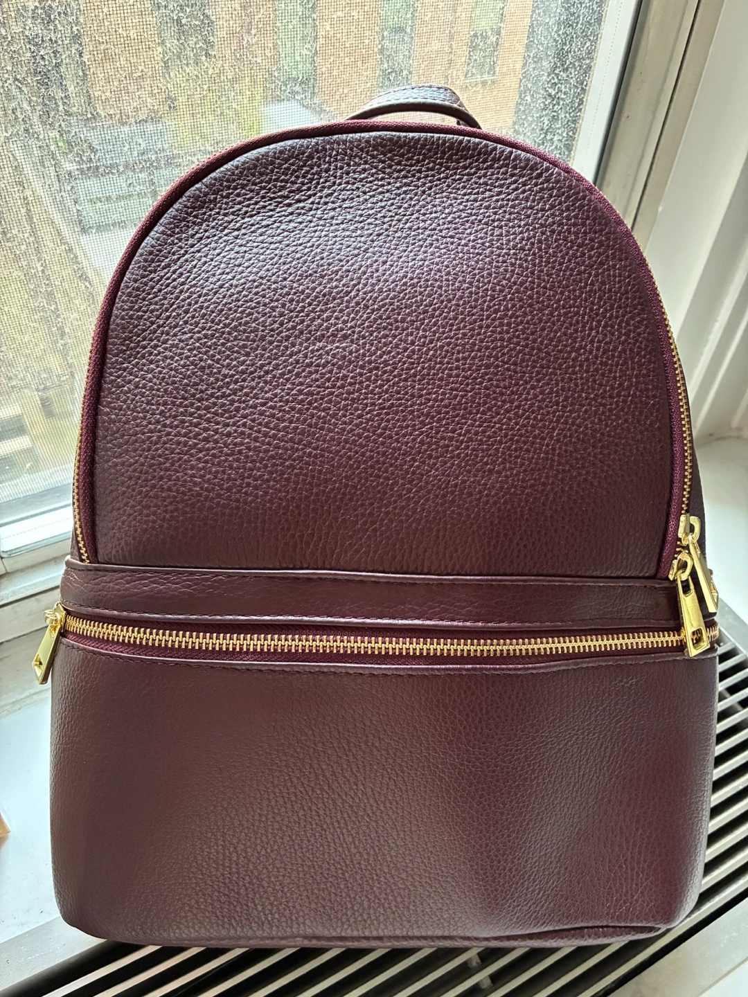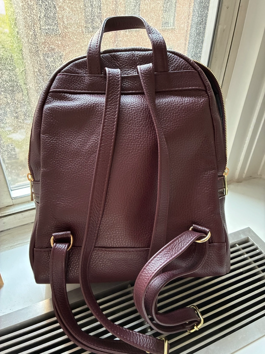 Maroon leather backpack, looks very spacious, can fit iPad. Made in Italy🇮🇹 Features gold hardware. Genuine leather. Great for carrying your essentials and for a trip.