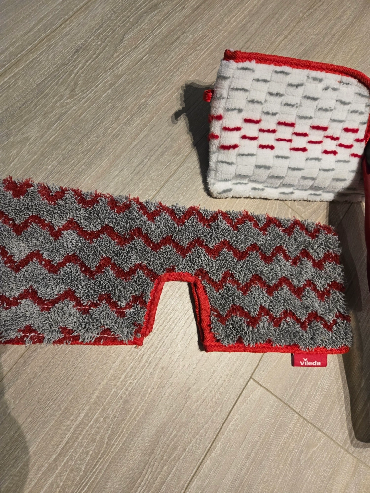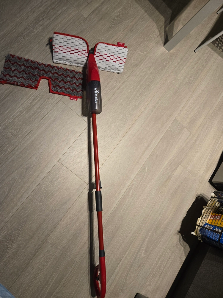 A spray mop in red and grey. Comes with two additional pads. The perfect item to help you relax while cleaning your floors.