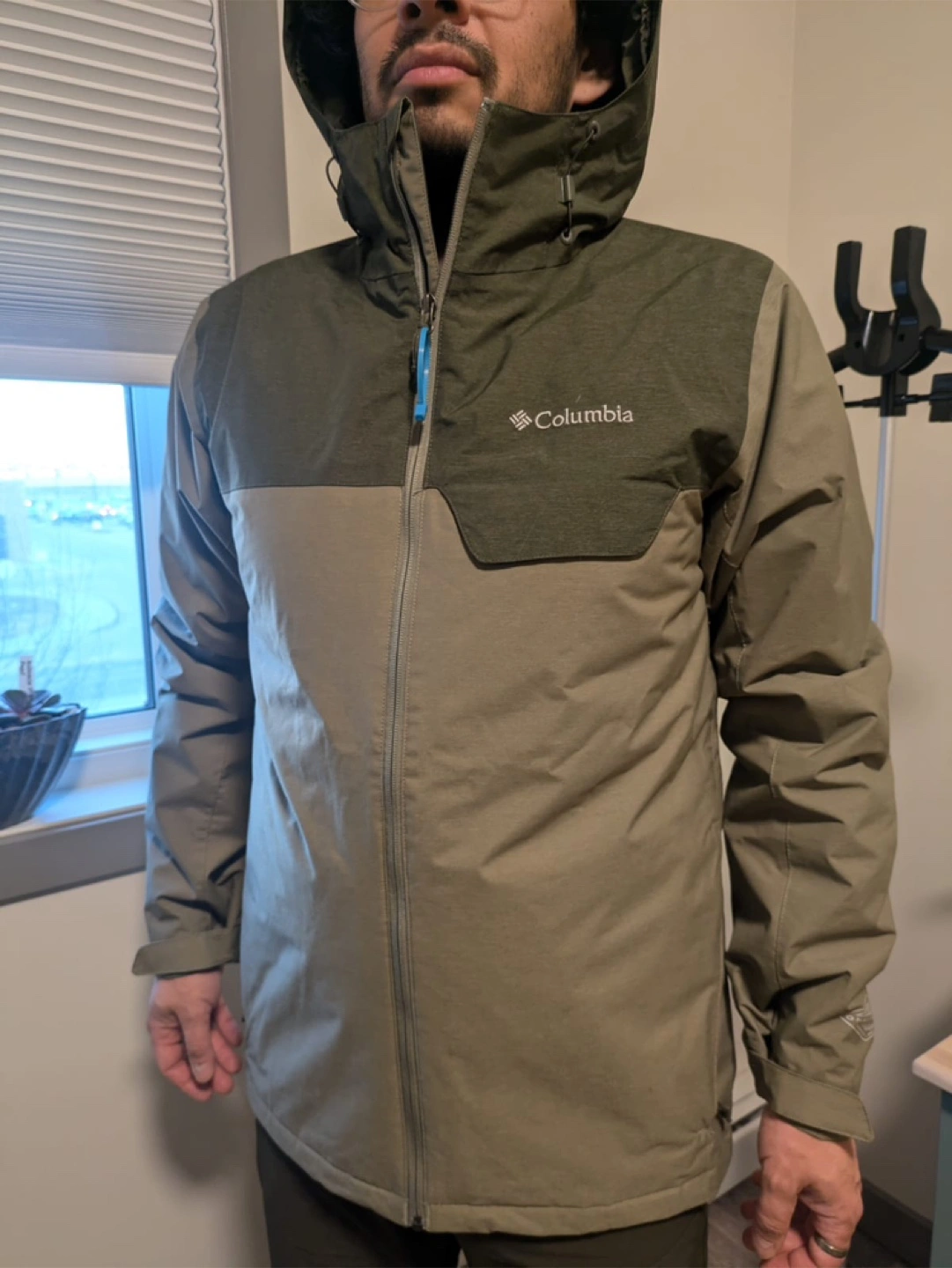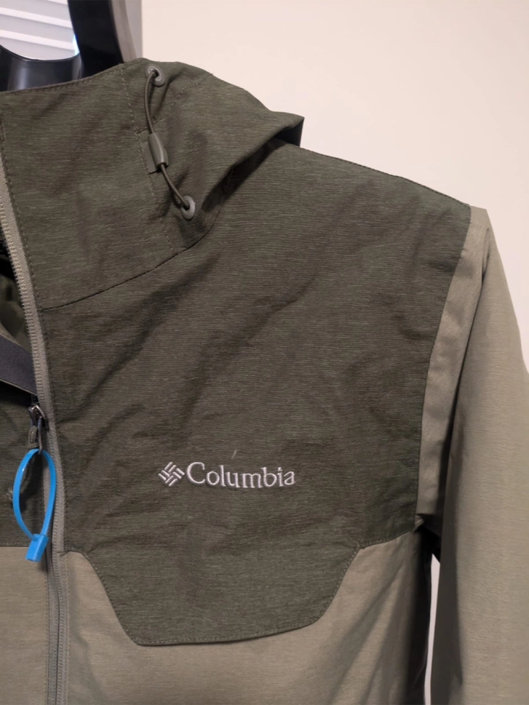 Embrace the elements with the Columbia raincoat, featuring a stylish green and gray two-tone design. This lightweight raincoat is perfect for outdoor adventures, offering both functionality and a modern aesthetic. Stay dry and comfortable with its attached hood and durable construction. Lovely jacket. Made with two tone shades of green and brown. Has a hood, zipper closure, and pockets. Great for those quiet walks through nature.