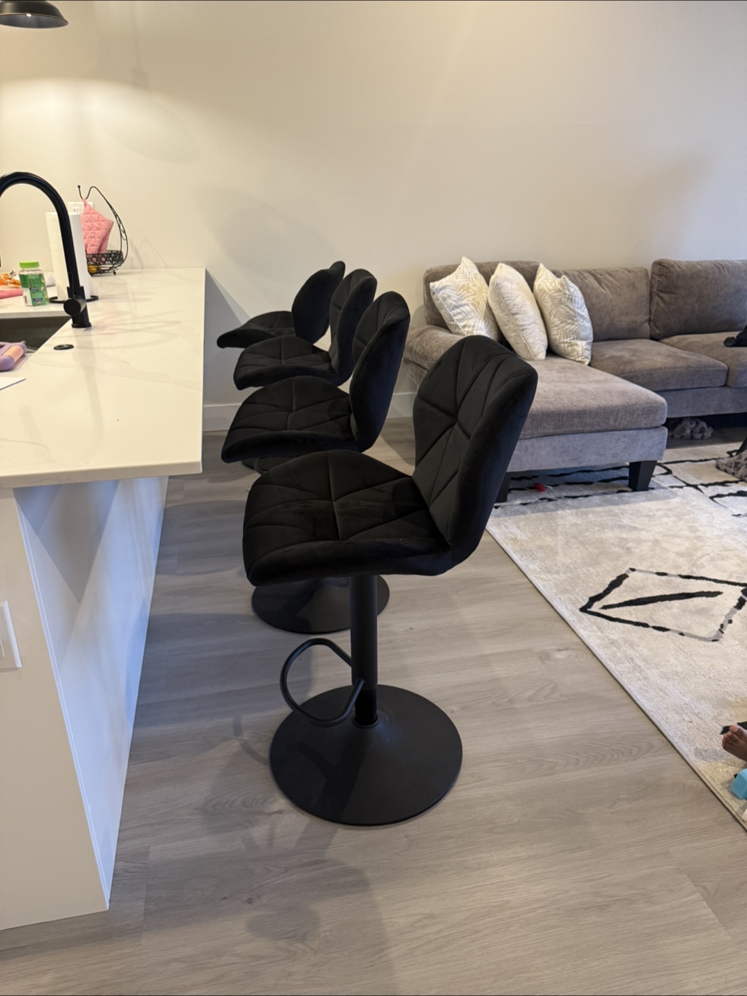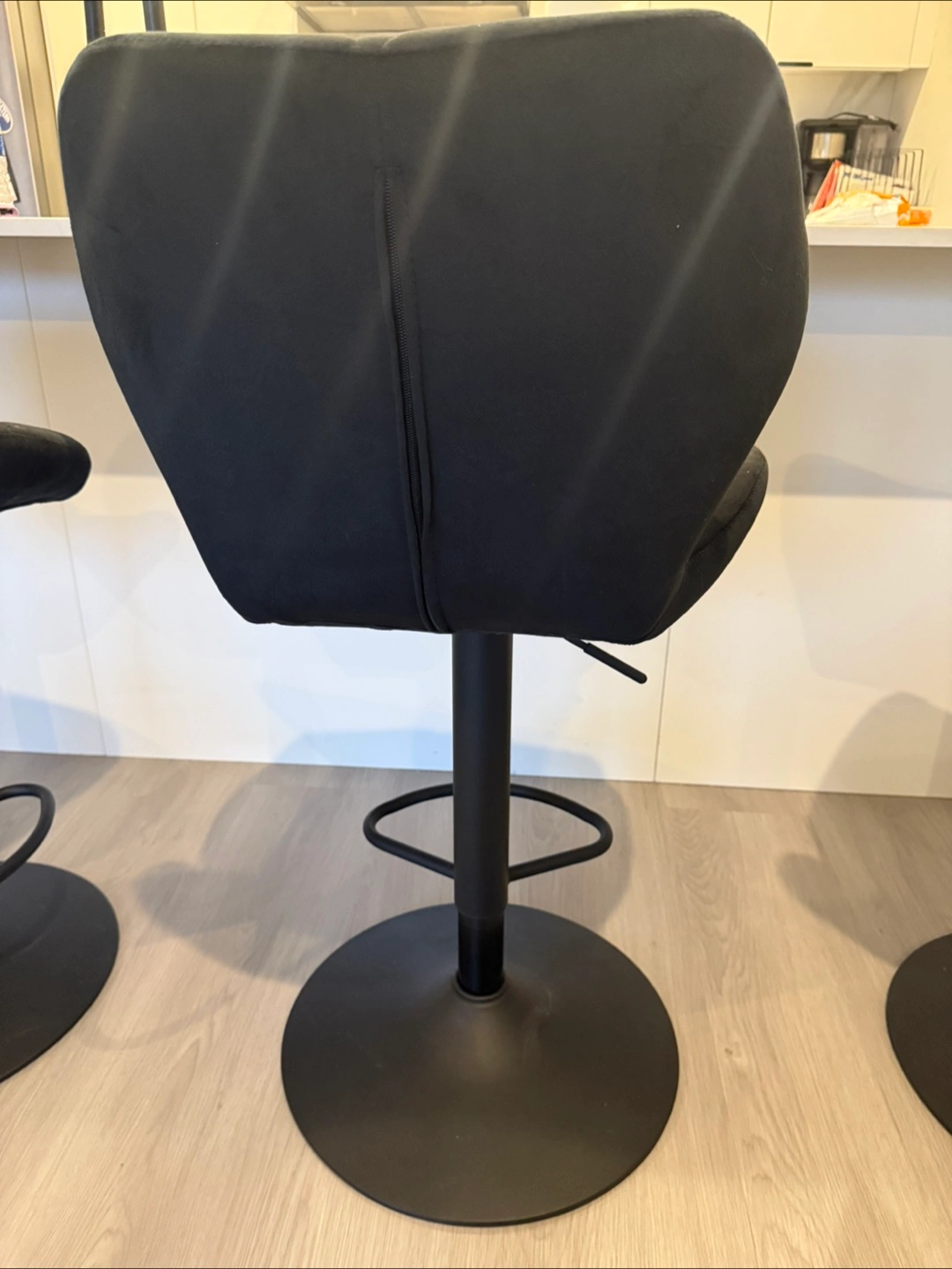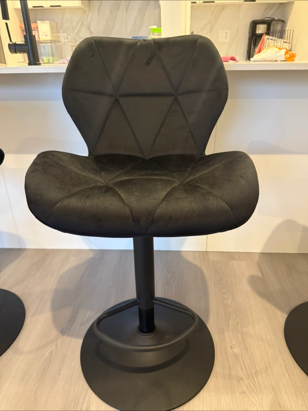 Black bar stools. Featuring a soft, velvet finish. Adjustable height and swivel capabilities. Their black color is a good match for a modern kitchen or bar setting. These stools are a fine choice for a cozy chat while sipping your morning coffee. $120 OBO