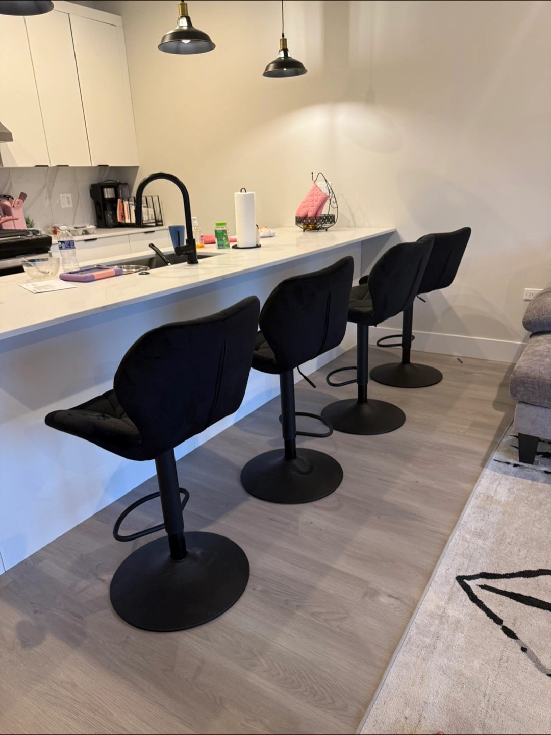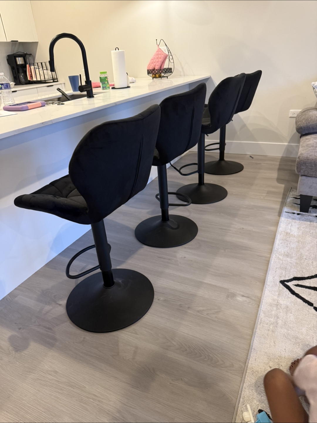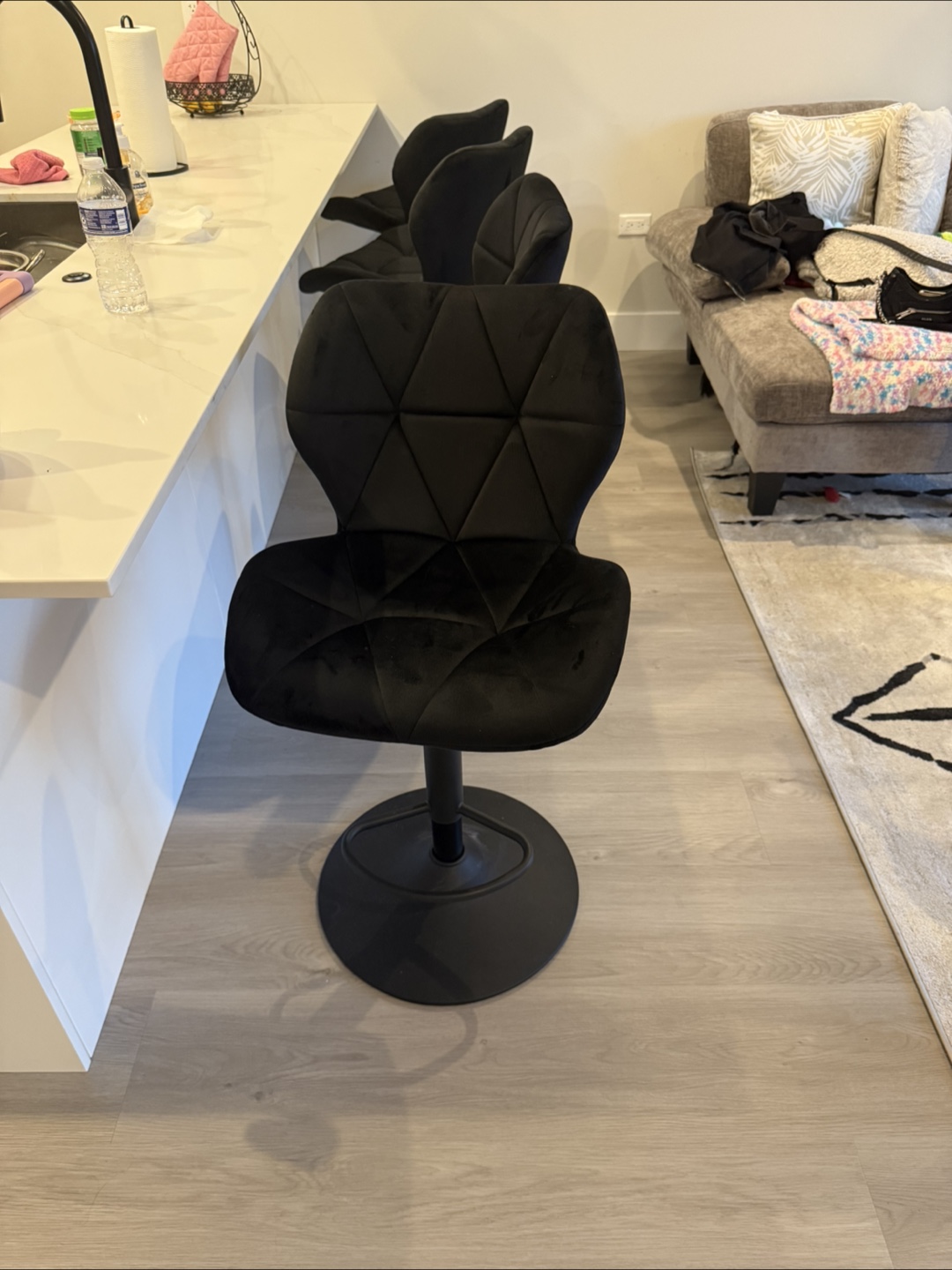 Black bar stools. Featuring a soft, velvet finish. Adjustable height and swivel capabilities. Their black color is a good match for a modern kitchen or bar setting. These stools are a fine choice for a cozy chat while sipping your morning coffee. $120 OBO