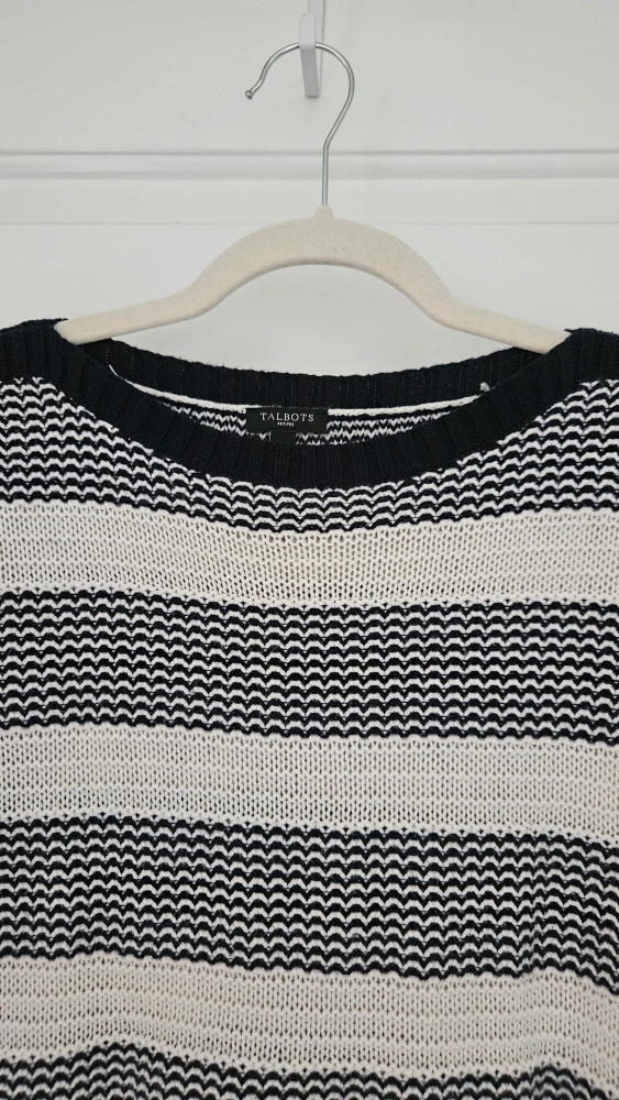 This is a Talbots Petites blue and white striped sweater in size MP (Medium Petite). Boat neck. It's a stylish and comfortable knit, perfect for layering or wearing on its own. The sweater is in really good condition.