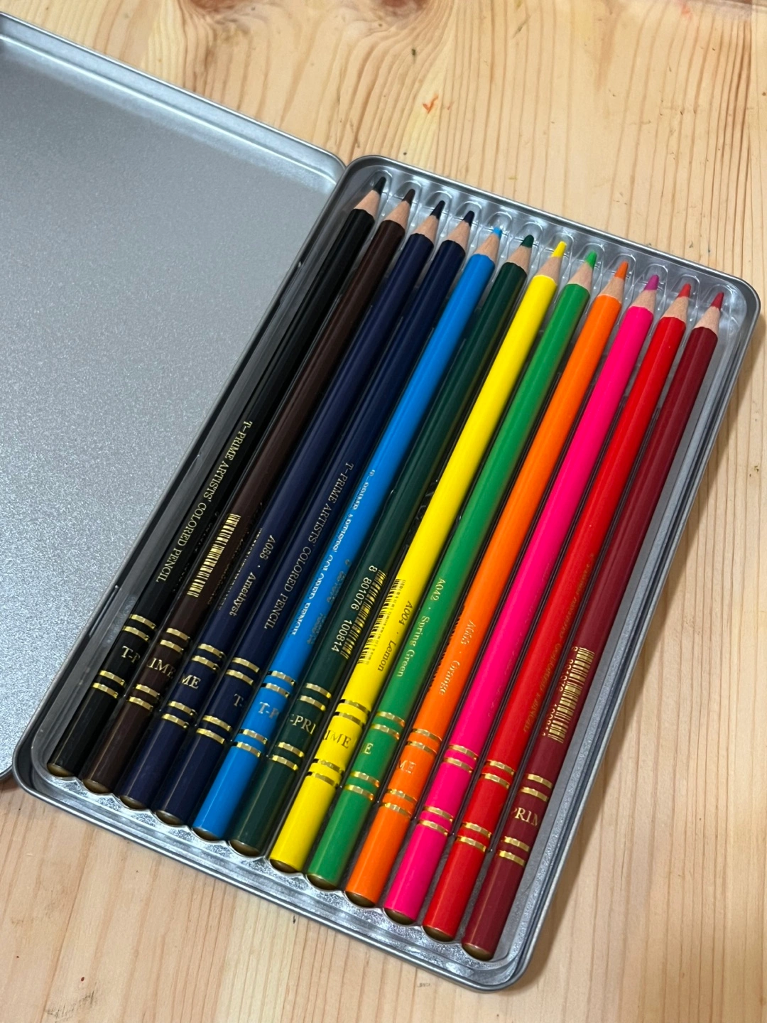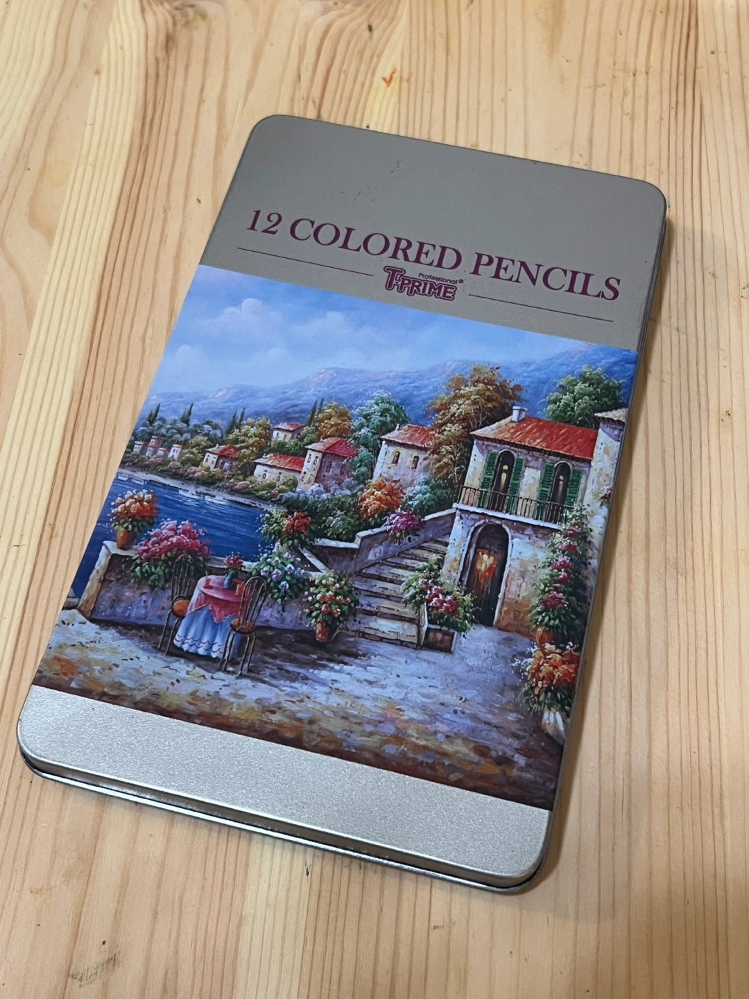 A set of 12 colored pencils inside a tin container. Colored pencils of various colors are visible. The tin's lid shows a landscape painting. A great way to take a break and relax.